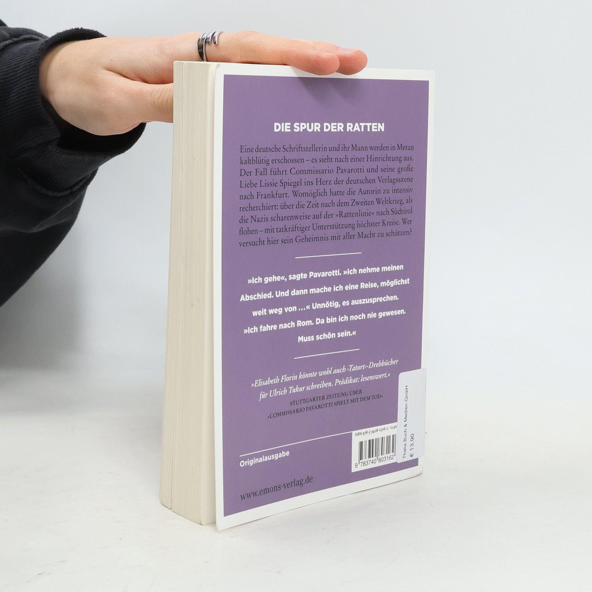 Düstere Spur in das Südtirol der Nachkriegszeit. Eine deutsche Schriftstellerin und ihr Mann werden in Meran kaltblütig erschossen – es sieht nach einer Hinrichtung aus. Der Fall führt Commissario Pavarotti und seine große Liebe Lissie von Spiegel ins Herz der deutschen Verlagsszene nach Frankfurt. Womöglich hat die Autorin zu intensiv recherchiert: über die Zeit nach dem Zweiten Weltkrieg, als die Nazis scharenweise auf der »Rattenlinie« nach Südtirol flohen – mit tatkräftiger Unterstützung höchster Kreise. Wer versucht hier sein Geheimnis mit aller Macht zu schützen?