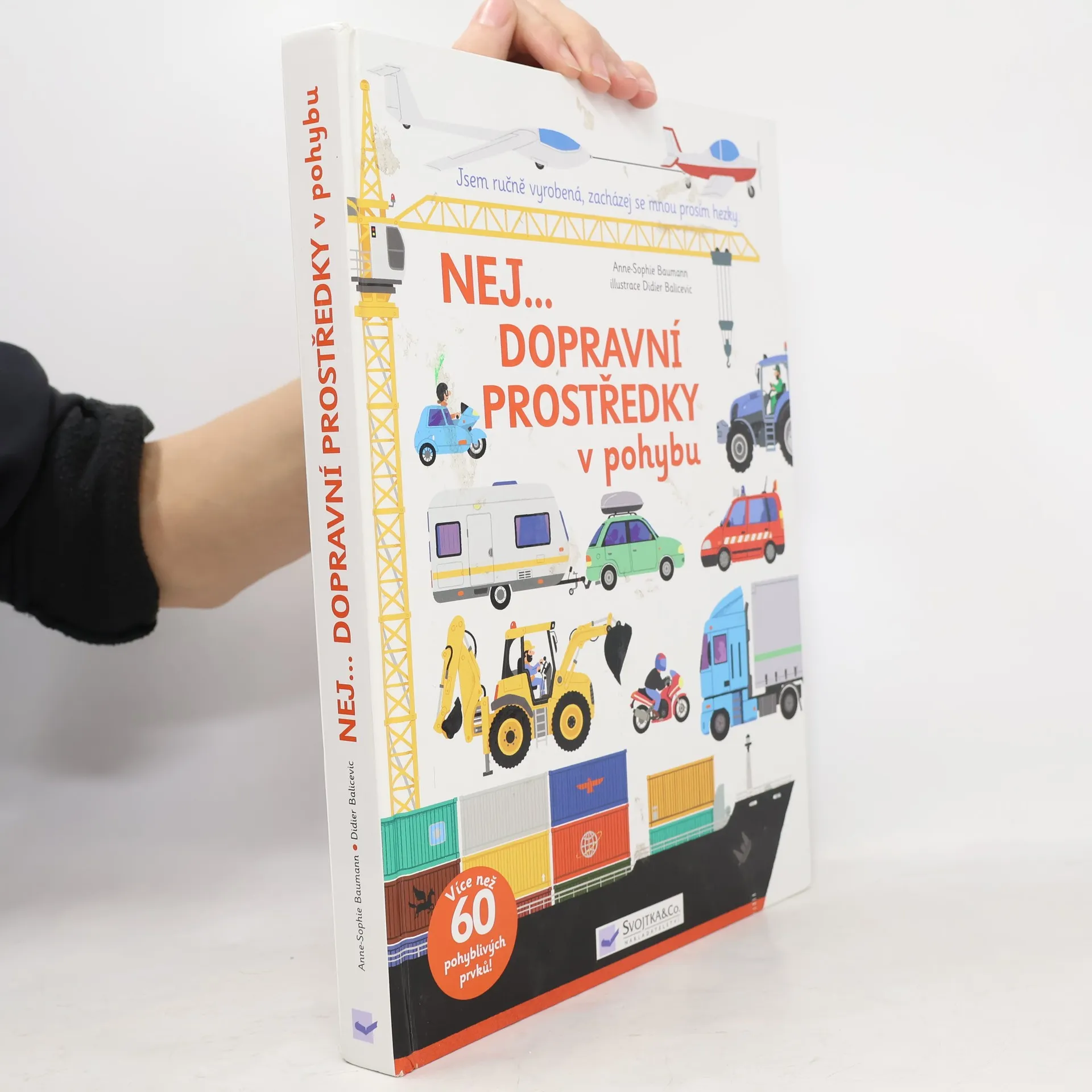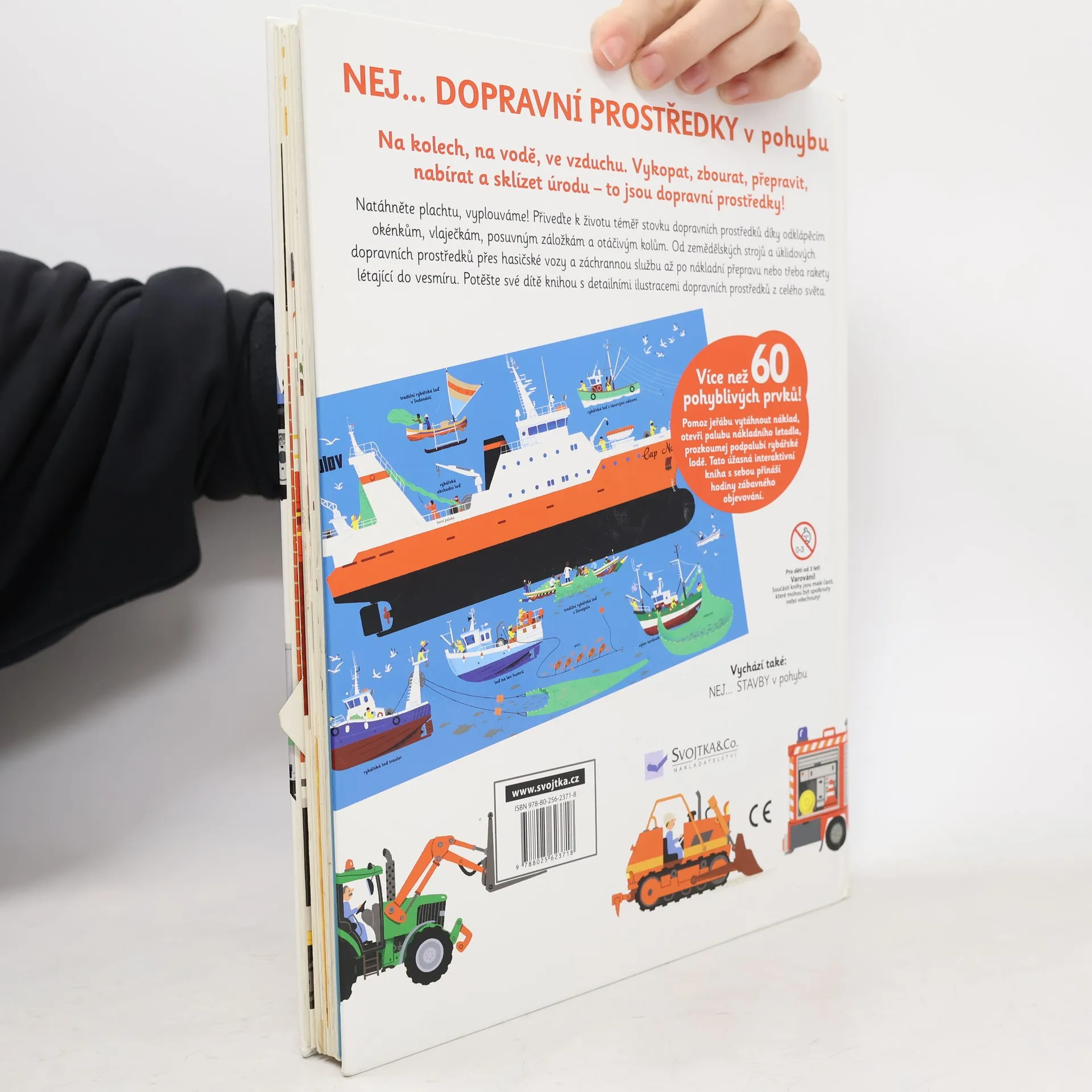 Vítejte ve světě strojů a lidí, kteří je obsluhují. Nechtěli byste se aspoň na chvíli stát jeřábníkem nebo bagristou. Neláká vás řídit vlak, hasičské auto nebo pilotovat letadlo? Encyklopedie Nej... Dopravní prostředky s pomocí tradičních odklápěcích okének a především díky řadě pohyblivých prvků umožní čtenářům vyzkoušet si nejrůznější činnosti, které vykonávají dopravní prostředky na stavbách, na poli, během městské údržby, hasičského zásahu, při rybolovu nebo při přepravě cestujících po souši, na železnici a ve vzduchu. Podíváte se, jak funguje jeřáb, kombajn, pluh, co všechno převáží kamiony, co se skrývá uvnitř rybářské lodi i vesmírné rakety. A to vše jen s pomocí obrázků a jednoduchých popisků, na své si tak přijdou ti úplně nejmenší, ale pobaví určitě i hravé rodiče.