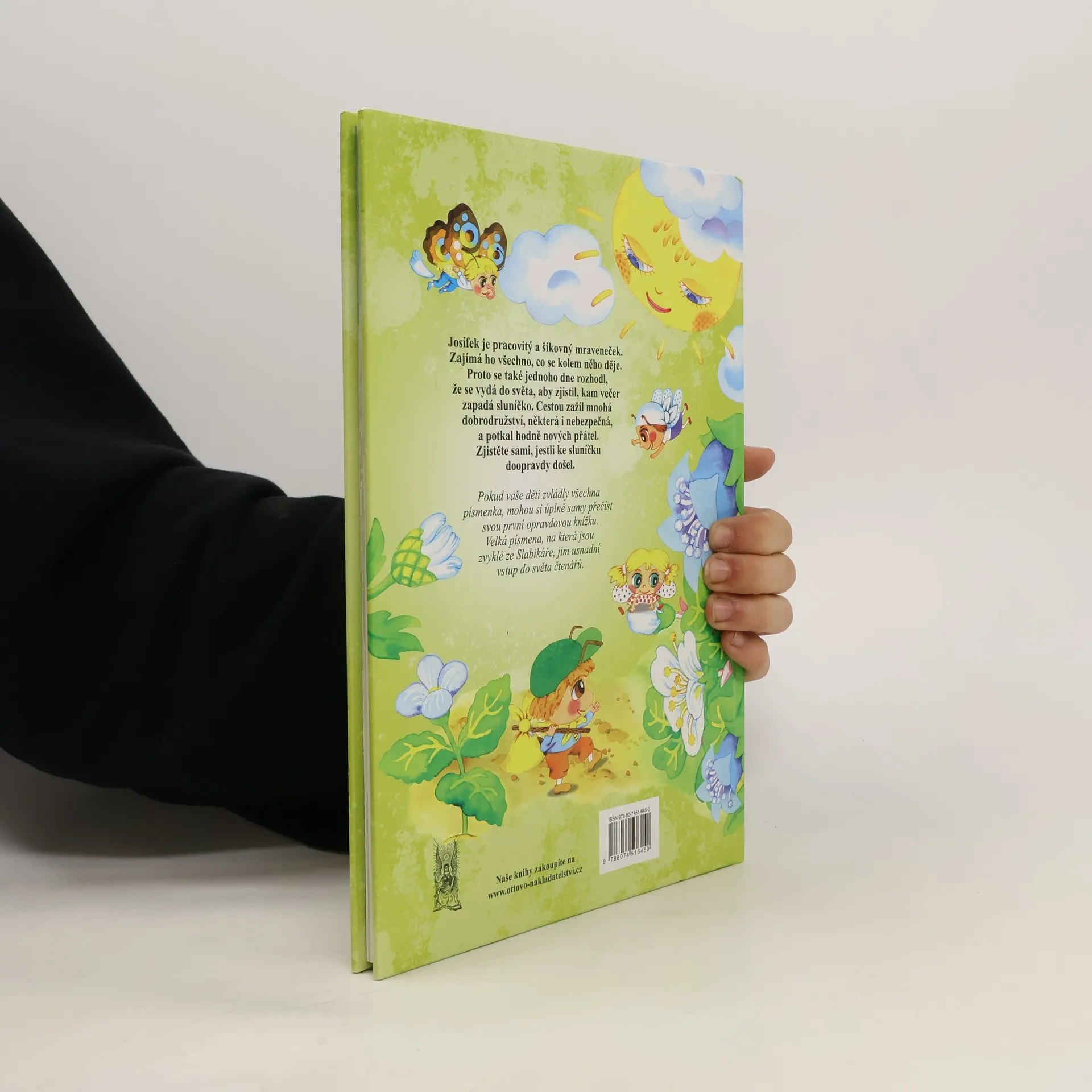 Josífek je pracovitý a šikovný mraveneček. Zajímá ho všechno, co se kolem něho děje. Proto se také jednoho dne rozhodl, že se vydá do světa, aby zjistil, kam večer zapadá sluníčko. Cestou zažil mnohá dobrodružství, některá i nebezpečná, a potkal hodně nových přátel. Zjistěte sami, jestli ke sluníčku doopravdy došel. Pokud vaše děti zvládly všechna písmenka, mohou si úplně samy přečíst svou první opravdovou knížku. Velká písmena, na která jsou zvyklé ze Slabikáře, jim usnadní vstup do světa čtenářů.