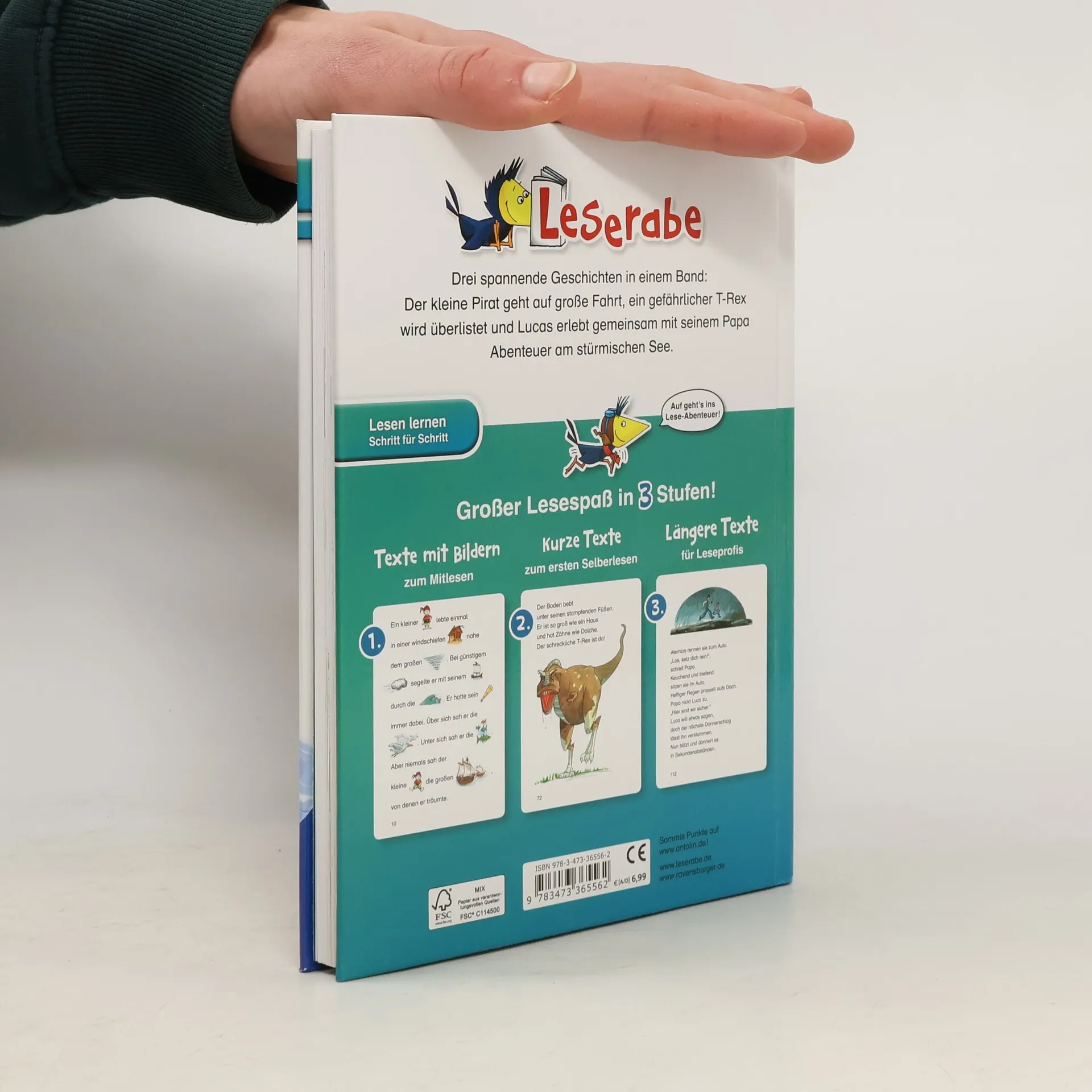 Kurzbeschreibung• Ideales Geschenk zur Einschulung • Bilder ersetzen Hauptwörter • Lesemotivation durch spannende Geschichten Drei spannende Geschichten in einem Band: Der kleine Pirat geht auf große Fahrt, ein gefährlicher T-Rex wird überlistet und Lucas erlebt gemeinsam mit seinem Papa Abenteuer am stürmischen See. Lesen lernen wie im Flug! Die Kinderbücher der Reihe Leserabe wurden mit Pädagogen entwickelt und richten sich an Leseanfänger ab dem Vorschulalter. Das große Leseraben-Buch der Abenteuergeschichten enthält drei Texte für Erstleser mit unterschiedlichem Schwierigkeitsgrad. Die Vor-Lesestufe ermöglicht, Kindern im Vorschulalter und deren Eltern als Leseteam erste gemeinsame Leseerlebnisse. Die kurzen Texte der ersten Lesestufe sind in großer Fibelschrift geschrieben, sichern erste Leseerfolge und steigern die Lesekompetenz. Spannende Geschichten in Fibelschrift wecken in der zweiten Lesestufe die Lesemotivation. So werden Leseanfänger Schritt für Schritt zum Leseprofi! Empfohlen von Stiftung Lesen. Weitere Informationen auf leserabe. de.