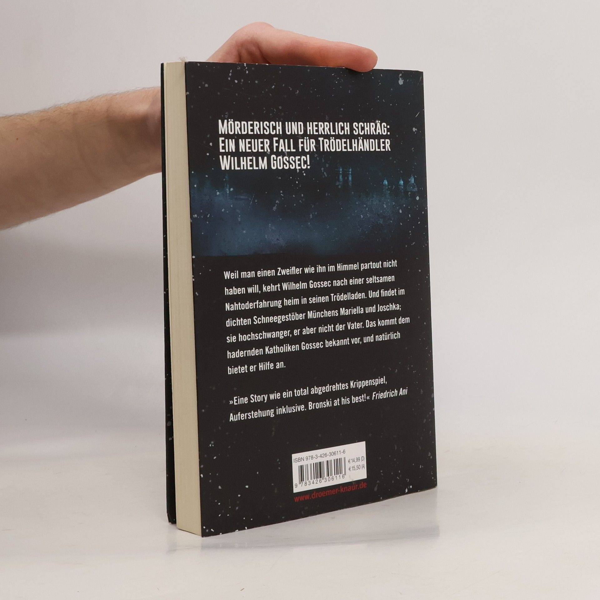 Der neue Kult-Krimi von Max Bronski – Fall Nr. 6 um Trödelhändler Gossec aus dem Münchner Schlachthofviertel „Eine Story wie ein total abgedrehtes Krippenspiel, Auferstehung inklusive. Bronski at his best!\" Friedrich Ani Wieder einmal gerät Wilhelm Gossec auf Abwege, diesmal auf biblische: Statt seine Waren auf dem Münchner Christkindlmarkt feilbieten zu können, muss er in einer kalten Dezembernacht in seinem Trödelladen einer jungen unbekannten Frau namens Mariella helfen, ihr Kind zur Welt zu bringen. Das Neugeborene wird Joshua genannt, wie es scheint, stellt der Himmel selbst Gossec eine Aufgabe. Doch damit nicht genug. Kurz darauf werden in der nahe gelegenen Maiklinik Neugeborene getötet, und jemand hat es offenbar auch auf Mariellas Baby abgesehen. Gossec beginnt, Nachforschungen anzustellen. Kuriose Begegnungen, himmlische Helfer, göttliche Eingebungen und der eine oder andere Wink des Schicksals treiben seine Ermittlungen voran. Und dann verschwinden Mariella und ihr Kind spurlos. Der notorische Zweifler Gossec fühlt sich einmal mehr im Stich gelassen. Wo bleibt denn nun die himmlische Gerechtigkeit? Der neue Krimi um Trödelhändler Gossec verbindet sprachliche Raffinesse mit einer rasanten, eigenwilligen Handlung, die voller Ironie und psychologischer Tiefe Münchner Lokalkolorit verbreitet wie keine andere. Gossec ist Kult!