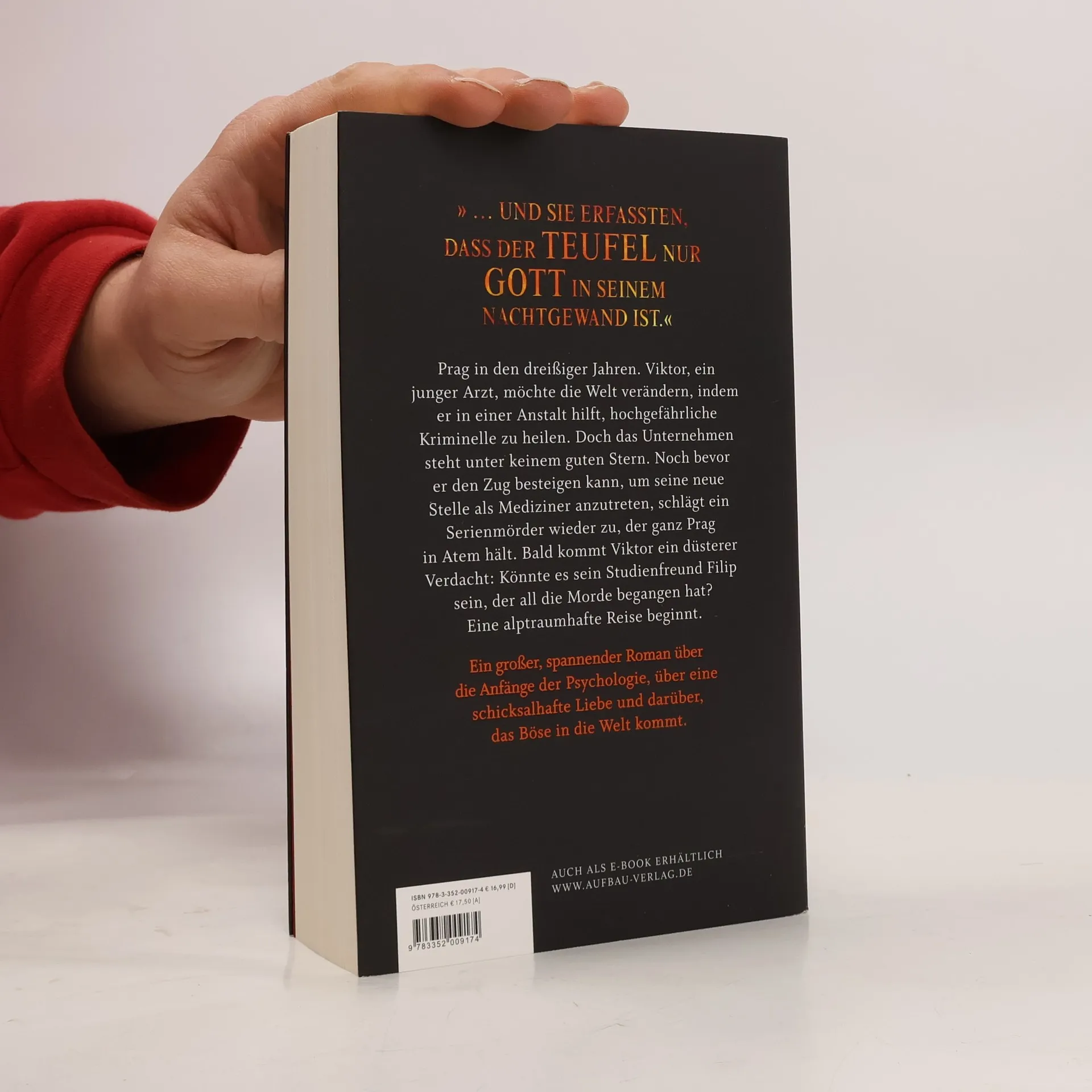 „ … und sie erfassten, dass der Teufel nur Gott in seinem Nachtgewand ist.“ Prag in den dreißiger Jahren. Viktor, ein junger Arzt, möchte die Welt verändern, indem er in einer Anstalt hilft, hochgefährliche Kriminelle zu heilen. Doch das Unternehmen steht unter keinem guten Stern. Noch bevor er den Zug besteigen kann, um seine neue Stelle als Mediziner anzutreten, schlägt ein Serienmörder wieder zu, der ganz Prag in Atem hält. Bald kommt Viktor ein düsterer Verdacht: Könnte es sein Studienfreund Filip sein, der all die Morde begangen hat? Eine alptraumhafte Reise beginnt. Ein großer, spannender Roman über die Anfänge der Psychologie, über eine schicksalhafte Liebe und darüber, wie das Böse in die Welt kommt.