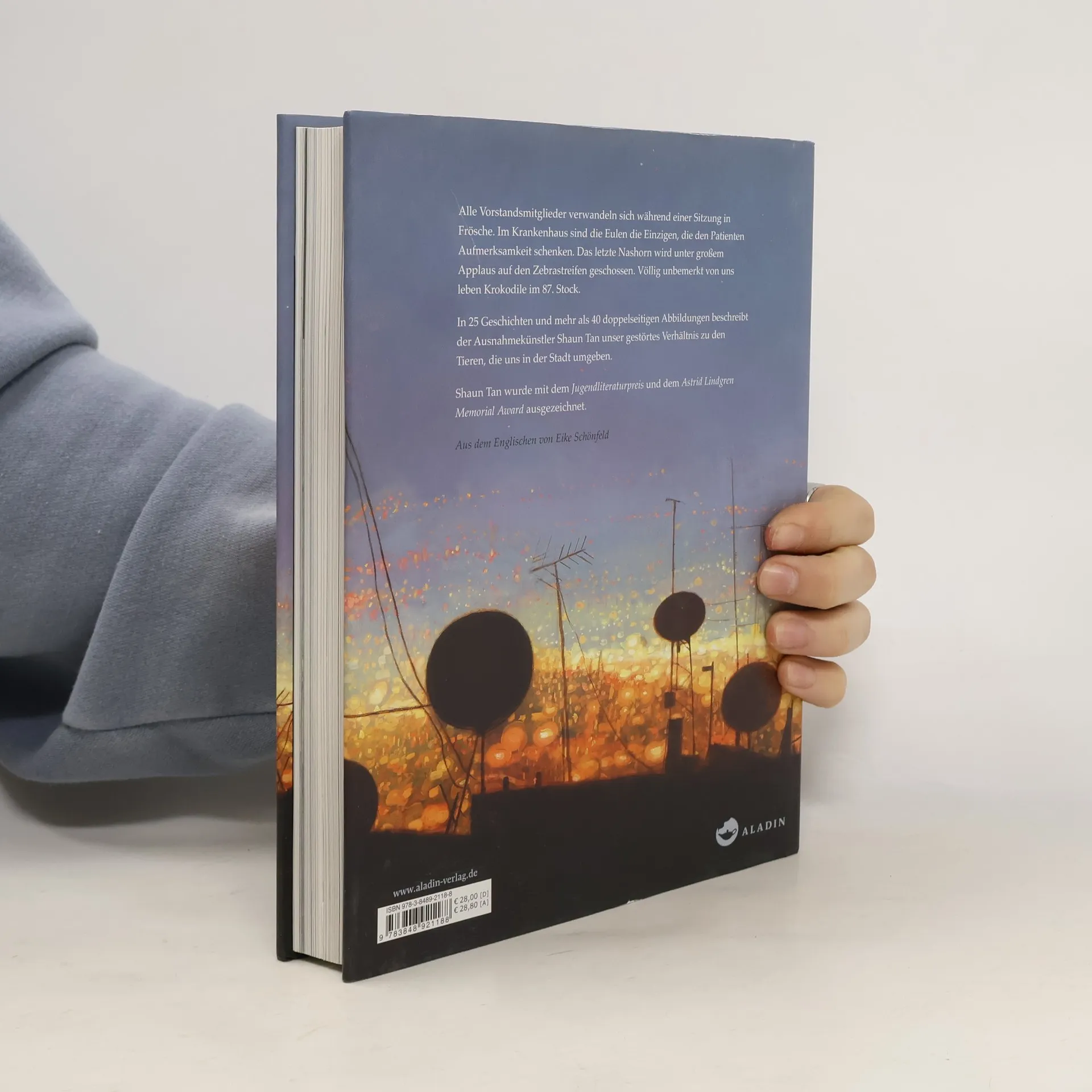 Während eines Meetings verwandeln sich alle Vorstandsmitglieder in Frösche. Kurz vor seiner Operation findet ein Patient im Krankenhaus Zuspruch bei einer Eule. Das letzte Nashorn wird unter Applaus auf einem Zebrastreifen erschossen. Im 87. Stock führen Krokodile unbemerkt ein sehr komfortables Leben. Der Ausnahmekünstler Shaun Tan beleuchtet in seinem neuesten Werk das sonderbare Verhältnis zwischen Mensch und Tier und schildert in traumartigen Sequenzen, wie Liebe und Fürsorge nicht selten Gleichgültigkeit und Grausamkeit gegenüberstehen. Die insgesamt 25 ganz unterschiedlichen Texte, die jeweils um doppelseitige Ölbilder ergänzt werden, wirken poetisch und düster, bergen aber auch viel Witz und Wärme und dringen tief ins Herz unserer urbanisierten Welt vor.