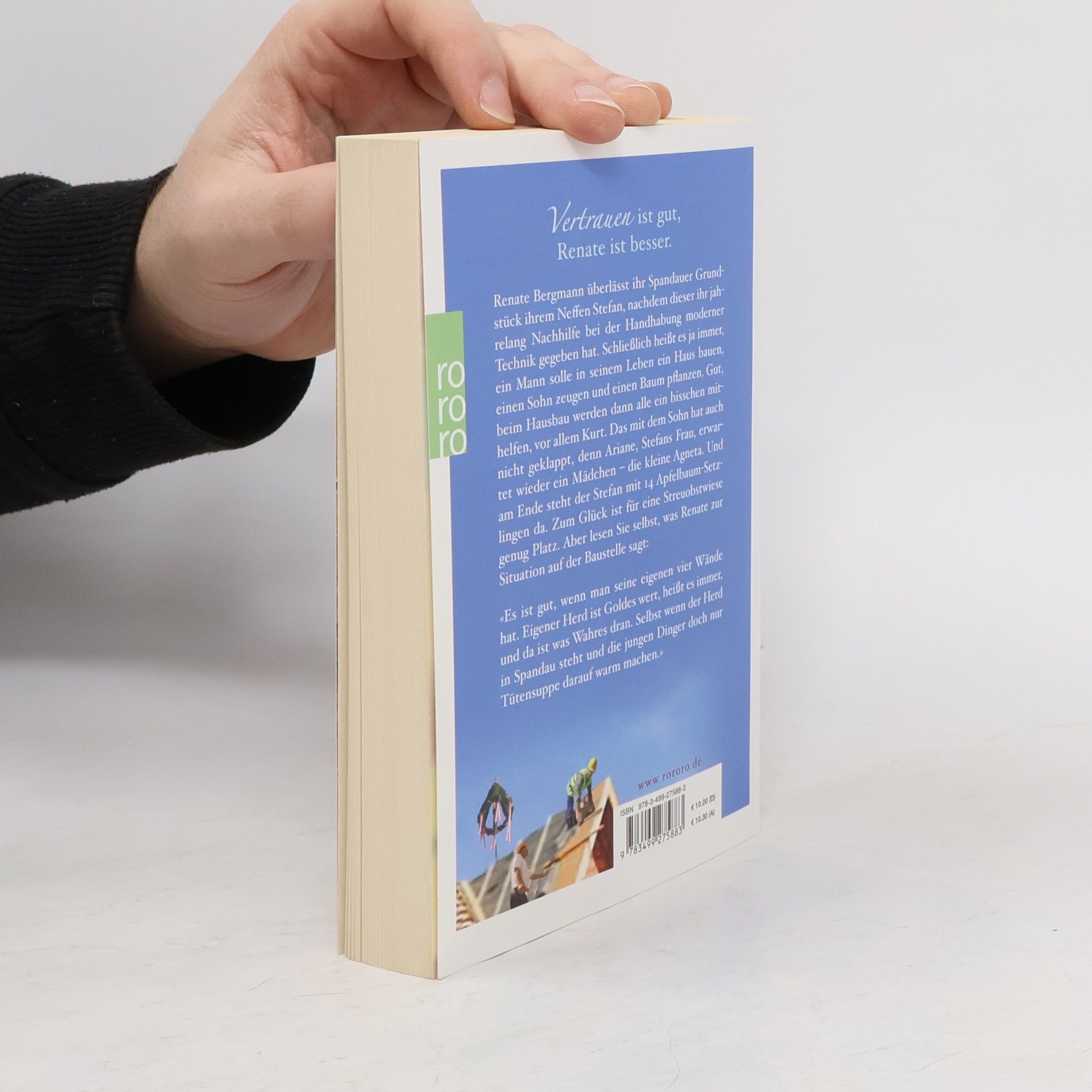 Vertrauen ist gut, Renate ist besser Renate Bergmann überlässt ihr Spandauer Grundstück Neffen Stefan, nachdem dieser ihr jahrelang Nachhilfe bei der Handhabung moderner Technik gegeben hat. Schließlich heißt es ja immer, ein Mann solle in seinem Leben ein Haus bauen, einen Sohn zeugen und einen Baum pflanzen. Gut, beim Hausbau werden dann alle ein bisschen mithelfen, vor allem Kurt. Das mit dem Sohn hat auch nicht geklappt, denn Ariane, Stefans Frau, erwartet wieder ein Mädchen - die kleine Agneta. Und am Ende steht der Stefan mit 14 Apfelbaum-Setzlingen da. Zum Glück ist für eine Streuobstwiese genug Platz. Aber lesen Sie selbst, was Renate zur Situation auf der Baustelle sagt: «Es ist gut, wenn man seine eigenen vier Wände hat. Eigener Herd ist Goldes wert , heißt es immer, und da ist was Wahres dran. Selbst, wenn der Herd in Spandau steht und die jungen Dinger doch nur Tütensuppe darauf warmmachen.»