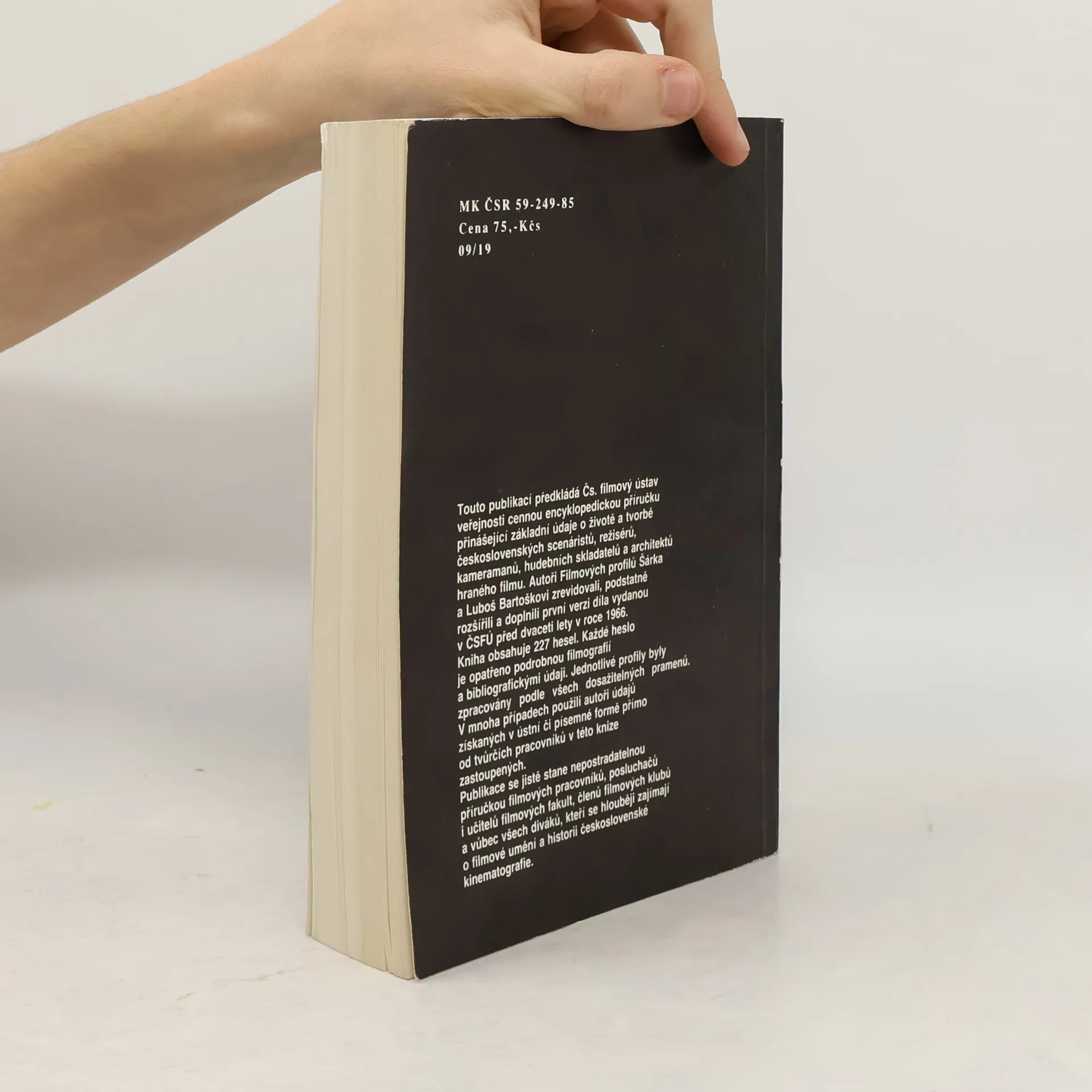 Touto publikací předkládá Čs. filmový ústav veřejnosti cennou encyklopedickou příručku přinášející základní údaje o životě a tvorbě československých scenáristů, režisérů, kameramanů, hudebních skladatelů a architektů hraného filmu. Autoři Filmových profilů Šárka a Luboš Bartoškovi zrevidovali, podstatné rozšířili a doplnili první verzi díla vydanou v ČSFÚ před dvaceti lety v roce 1966. Kniha obsahuje 227 hesel. Každé heslo je opatřeno podrobnou filmografií a bibliografickými údaji. Jednotlivé profily byly zpracovány podle všech dosažitelných pramenů. V mnoha případech použili autoři údajů získaných v ústní či písemné formě přímo od tvůrčích pracovníků v této knize zastoupených. Publikace se jistě stane nepostradatelnou příručkou filmových pracovníků, posluchačů i učitelů filmových fakult, členů filmových klubů a vůbec všech diváků, kteří se hlouběji zajímají o filmové umění a historii československé kinematografie.