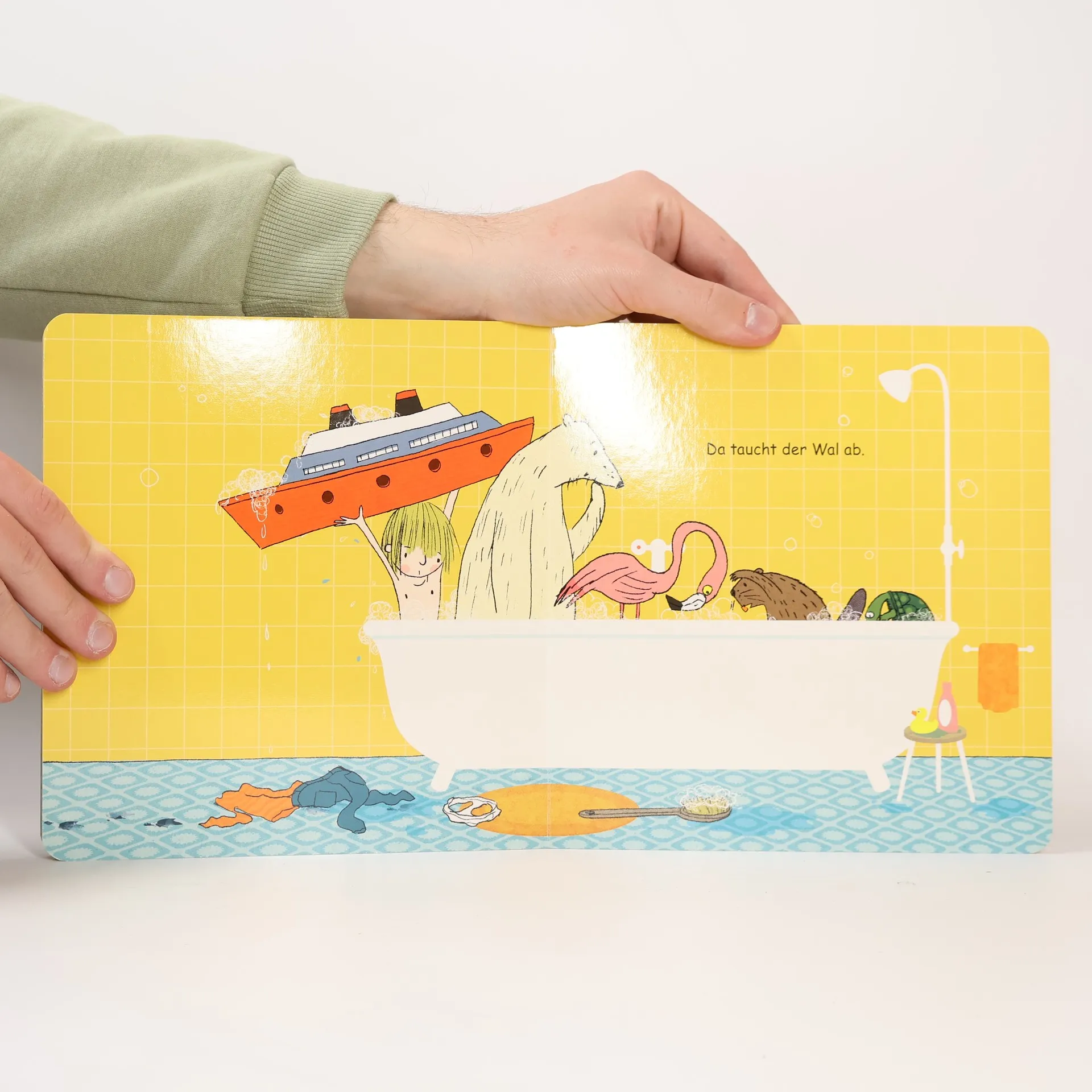 Heute ist Badetag. Der Wal nimmt ein Bad. Herrlich! Was der Wal genießt, das wollen die anderen auch - das kennt man ja. Da stehen sie schon und möchten mit in den Schaum: die Schildkröte, weil der Rücken schmerzt, der Biber, weil er friert, der Flamingo, weil die Beine schmutzig sind und der Eisbär, weil sein Fell riecht. Der Wal ist geduldig, in der Wanne wird es eng. Erst als auch das Kind samt Schiff ins Wasser steigt, ist es soweit - der Wal verschafft sich Platz auf seine Art! Endlich Ruhe. Herrlich!