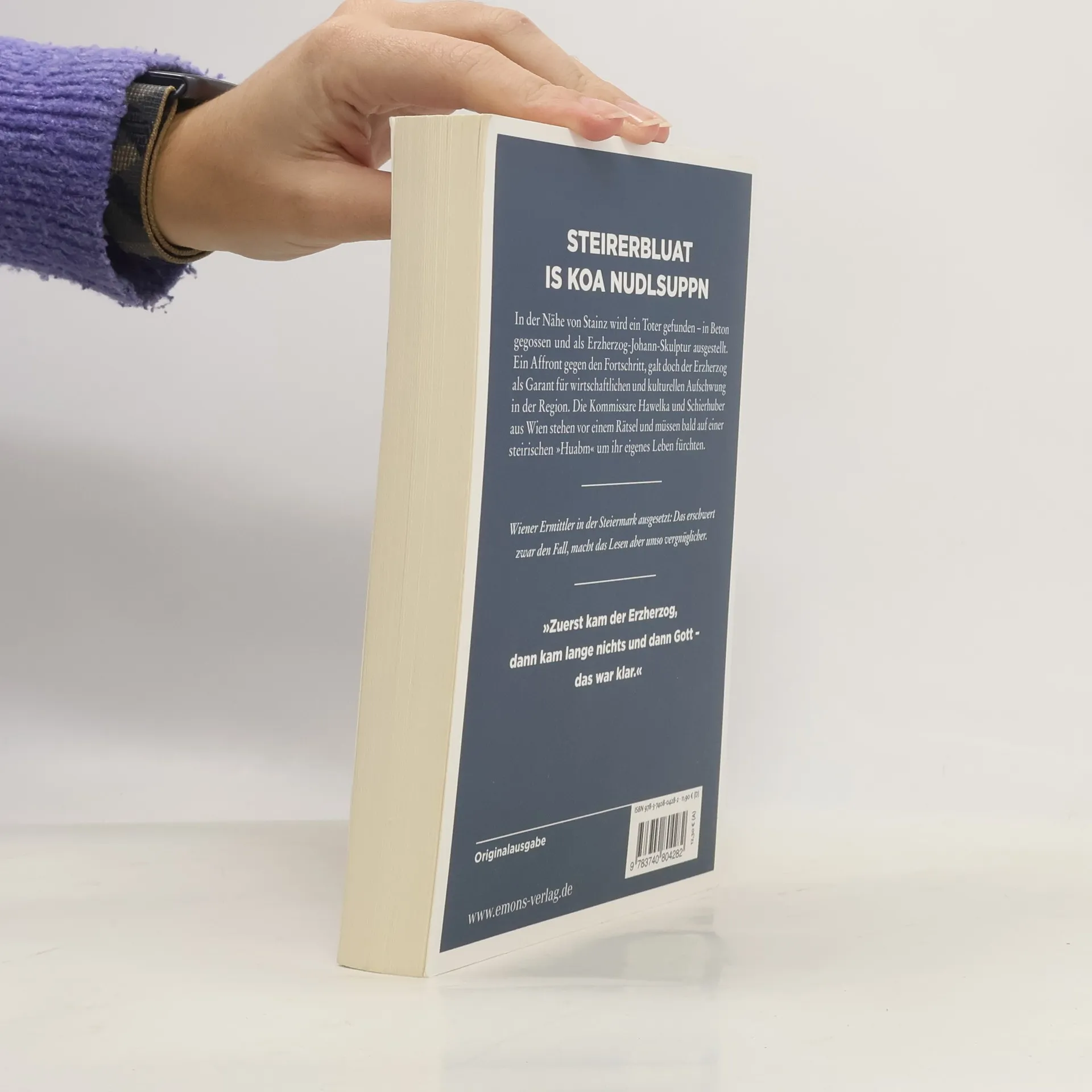 Ein skurriler Kriminalroman aus der steirischen Idylle. 'Nicht Johann sollst du ehren, sondern Leuthold!' – Eigentlich ein schöner Satz. Aber mit Blut auf einen Sockel geschmiert wirkt er gleich etwas weniger schön. Und wenn auf dem Sockel statt der Statue des Erzherzogs Johann eine künstlerisch fragwürdige Betonfigur steht, ist das überhaupt nicht mehr schön. Und wenn in dieser Figur die Leiche eines Mannes steckt, dann gefriert einem leicht das Blut in den Adern. Hawelka und Schierhuber ermitteln und müssen bald auf einer steirischen 'Huabm' um ihr eigenes Leben fürchten.