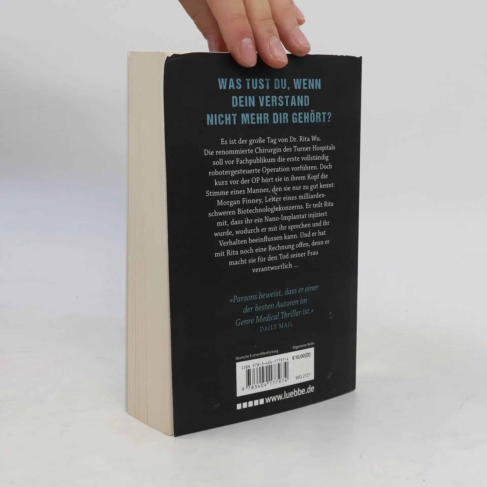 Es ist der große Tag von Dr. Rita Wu. Die renommierte Chirurgin des Turner Hospitals soll vor Fachpublikum die erste vollständig robotergesteuerte Operation vorführen. Doch kurz vor der OP hört sie in ihrem Kopf die Stimme eines Mannes, den sie nur zu gut kennt: Morgan Finney, Leiter eines Biotechnologiekonzerns. Er teilt Rita mit, dass ihr ein Nano-Implantat injiziert wurde, wodurch er mit ihr sprechen und ihr Verhalten beeinflussen kann. Und er hat mit Rita noch eine Rechnung offen, denn er macht sie für den Tod seiner Frau verantwortlich ...