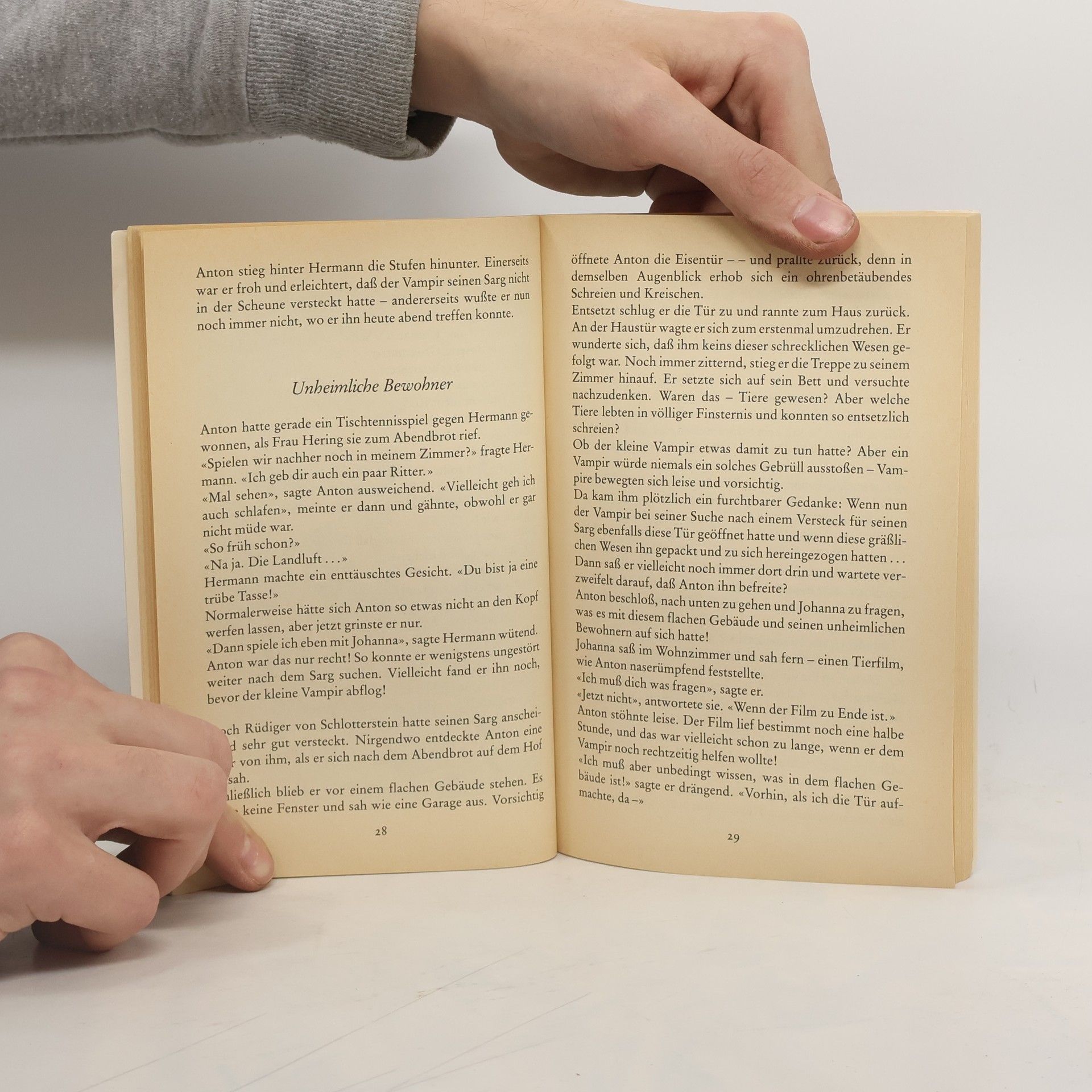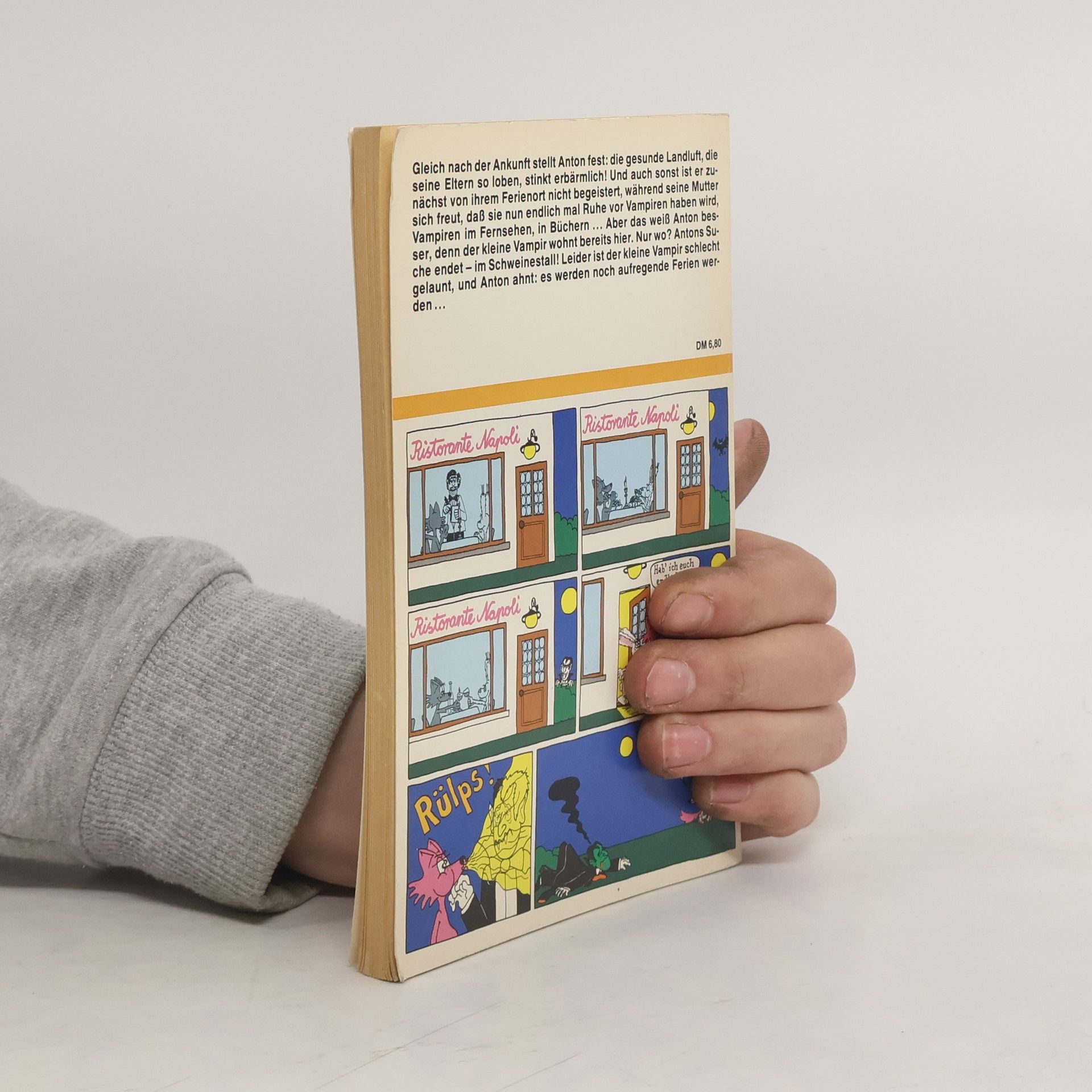 Gleich nach der Ankunft stellt Anton fest: Die gesunde Landluft stinkt erbärmlich! Und auch sonst ist er zunächst von ihrem Ferienort nicht begeistert, während seine Mutter sich freut, dass sie nun endlich Ruhe vor Vampiren haben wird. Aber das weiß Anton besser, denn der kleine Vampir wohnt bereits hier. Nur wo? Antons Suche endet – im Schweinestall!