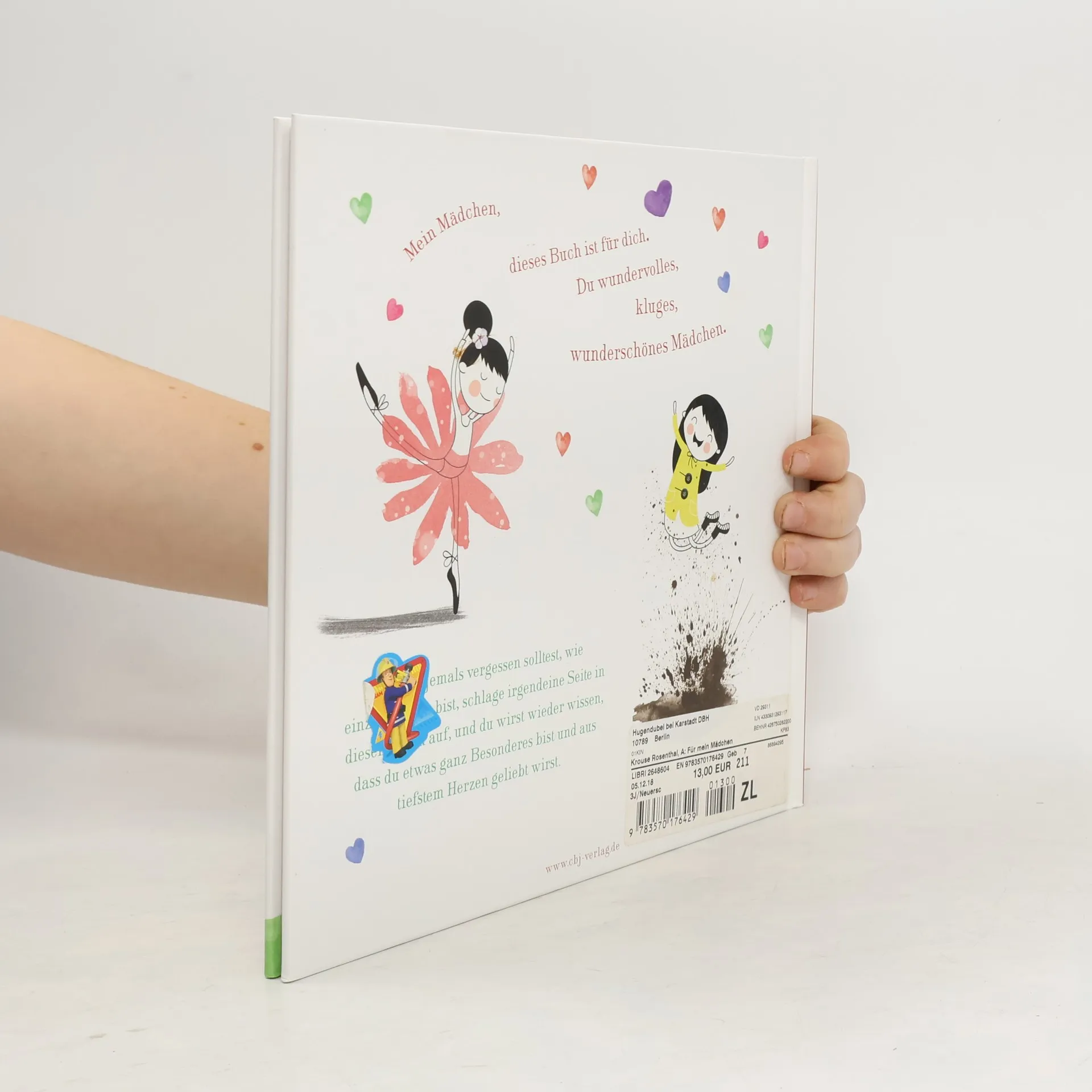 Mein Mädchen. Glaub an dich, folge deinem Herzen und höre niemals auf zu staunen. »Für mein Mädchen« ist eine Liebeserklärung an all die Mädchen dieser Welt. Auf jeder einzelnen Seite feiert es die Einzigartigkeit eines jeden Mädchens und ermuntert dazu, stolz und stark man selbst zu sein; aus der Reihe zu tanzen, wenn es nötig ist, und Nein zu sagen, wenn man »Nein« denkt. Es ist ein inspirierender Mutmacher, Starkmacher und Glücklichmacher, das jedes (kleine und große) Mädchen wie eine liebevolle Umarmung daran erinnern soll, dass es geliebt wird und etwas ganz Besonderes ist. Ausstattung: Mit fbg. Illustrationen