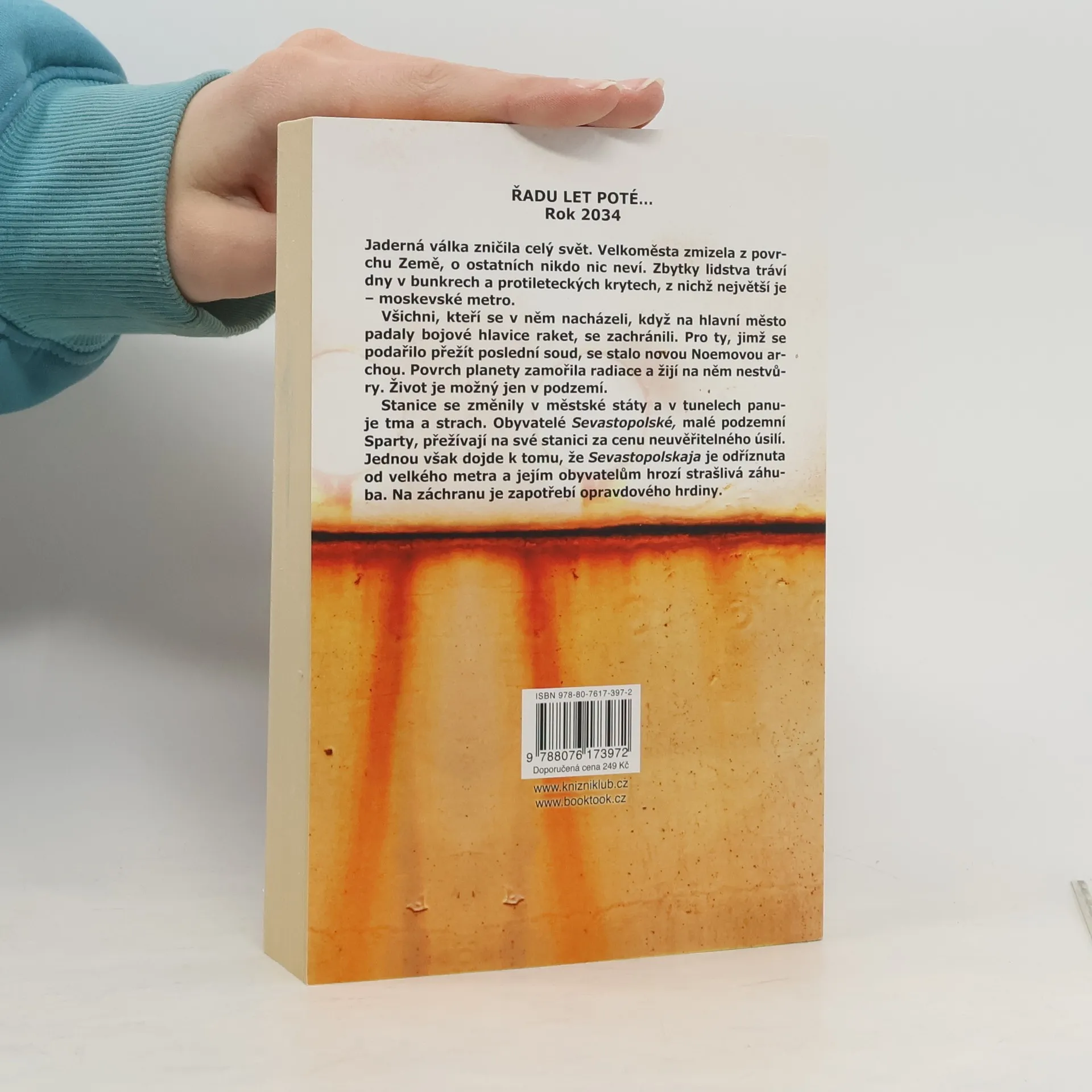 3. vydání. ŘADU LET POTÉ… Rok 2034 Jaderná válka zničila celý svět. Velkoměsta zmizela z povrchu Země, o ostatních nikdo nic neví. Zbytky lidstva tráví dny v bunkrech a protileteckých krytech, z nichž největší je – moskevské metro. Všichni, kteří se v něm nacházeli, když na hlavní město padaly bojové hlavice raket, se zachránili. Pro ty, jimž se podařilo přežít poslední soud, se stalo novou Noemovou archou. Povrch planety zamořila radiace a žijí na něm nestvůry. Život je možný jen v podzemí. Stanice se změnily v městské státy a v tunelech panuje tma a strach. Obyvatelé Sevastopolské, malé podzemní Sparty, přežívají na své stanici za cenu neuvěřitelného úsilí. Jednou však dojde k tomu, že Sevastopolskaja je odříznuta od velkého metra a jejím obyvatelům hrozí strašlivá záhuba. Na záchranu je zapotřebí opravdového hrdiny.
