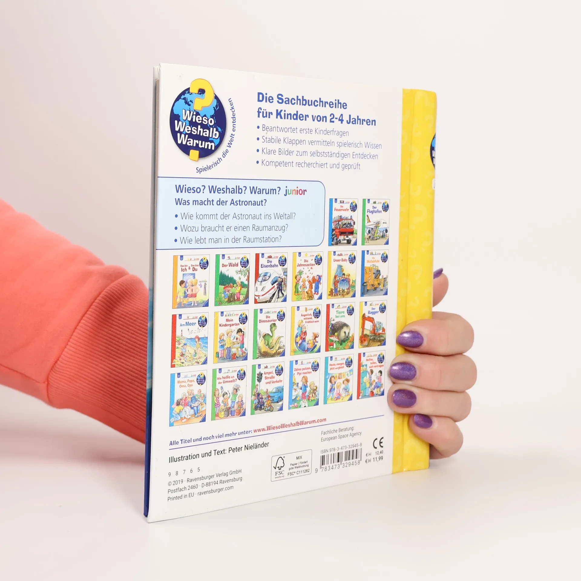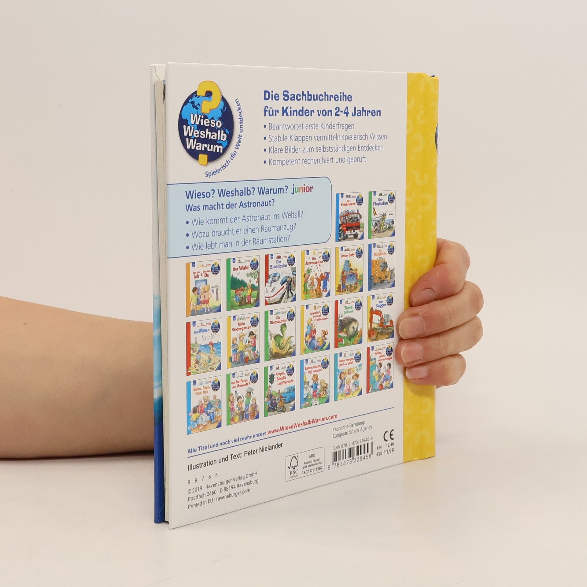 3 - 2 - 1: Ready for take-off! Das Buch begleitet einen Astronauten und seine Crew bei ihrer spannenden Reise ins All. Wie leben sie in der Raumstation? Woraus besteht ein Raumanzug? Und was essen Astronauten? Kleine Raumfahrtfans erfahren alles über den Alltag in der Raumstation, das vorbereitende Training und die Aufgaben der Frauen und Männer im All. Faszinierende Bilder und viele Klappen verdeutlichen die Schönheit des Weltraums. Wieso? Weshalb? Warum? junior Die Sachbuchreihe für Kinder von 2-4 Jahren Jeden Tag entdecken Kinder etwas Neues – und haben viele Fragen. Wann kommt die Feuerwehr? Was machen die Tiere im Winter? Warum muss ich Zähne putzen? Die beliebte Sachbuchreihe Wieso? Weshalb? Warum? junior beantwortet die Fragen der Kinder auf Augenhöhe. Sie beleuchtet unterschiedlichste Themen aus ihrer Alltags- und Interessenswelt altersgerecht und mit viel Liebe zum Detail. Die Reihe ist speziell auf kleine Hände und die Bedürfnisse der Kleinsten angepasst. Klare und liebevolle Bilder, kurze Sachtexte sowie handliche Klappen, die Bewegungen veranschaulichen und überraschende und lustige Einblicke gewähren, ermöglichen Kindern, sich ihre Themen selbst zu erschließen. Der Spaß am eigenhändigen Entdecken, die liebevolle Umsetzung und die hochwertige Ausstattung garantieren langanhaltende Freude an jedem Buch.