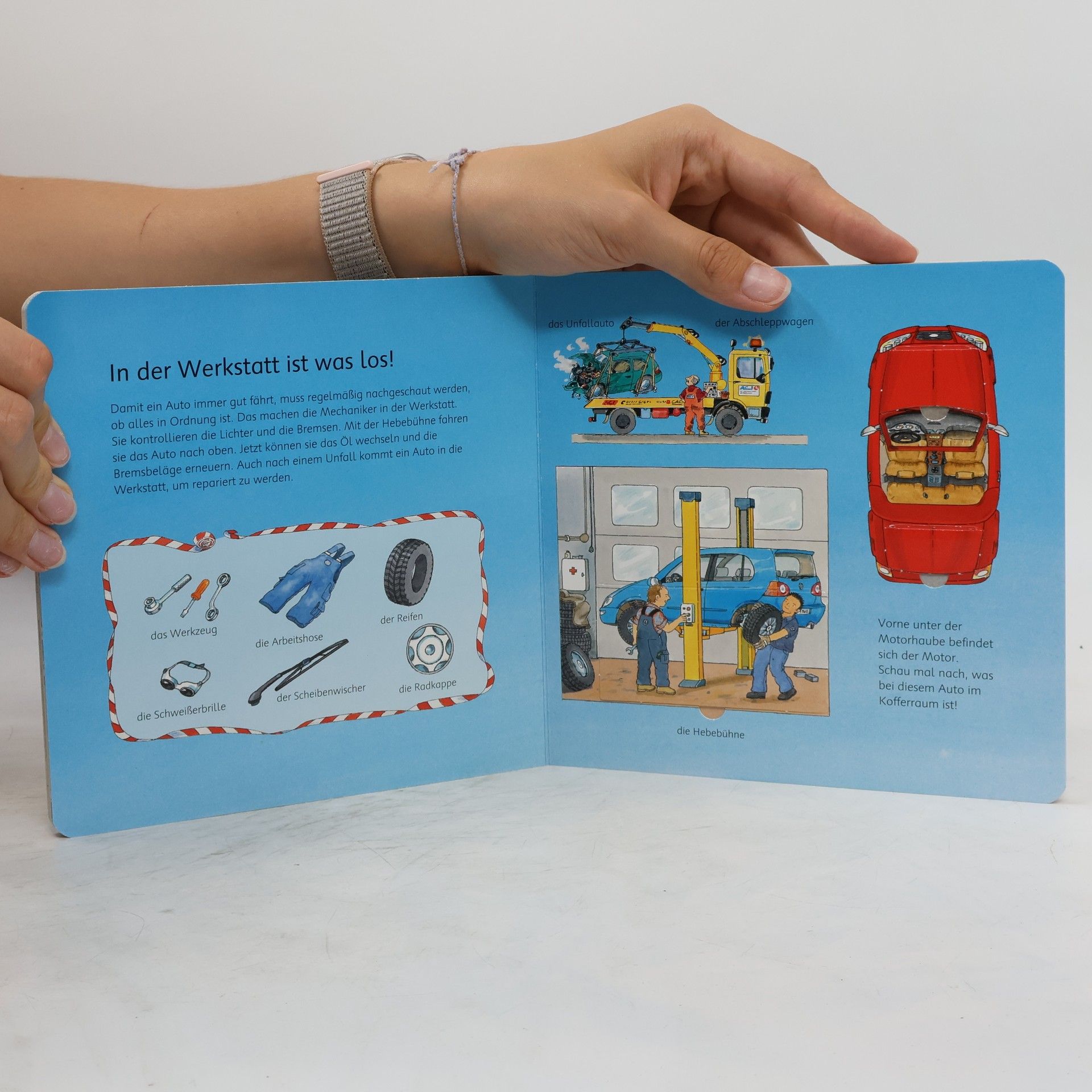 Landmaschinen, Baufahrzeuge, Feuerwehr und Co.- in diesem Buch kann man sie alle finden. Große Klappen zeigen, wie ein Kran funktioniert oder das Auto auf der Hebebühne hochfährt und sogar eine Formel 1 Rennstrecke kann aufgeklappt werden.