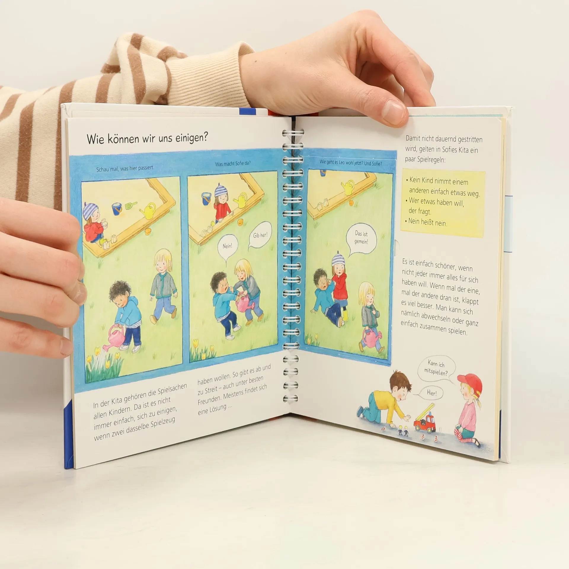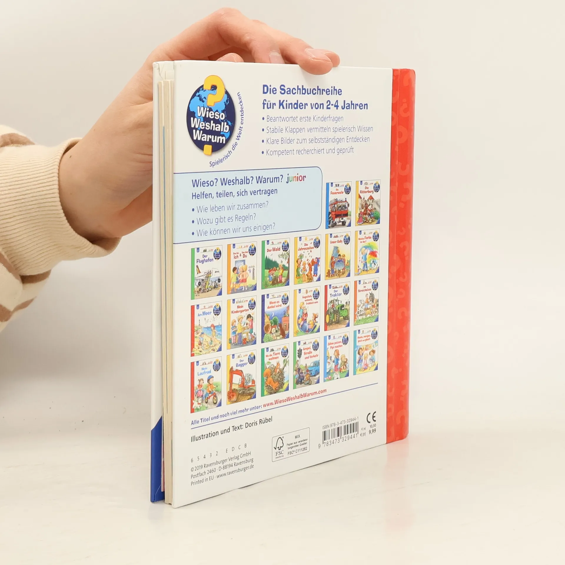 Zu Hause, im Kindergarten, auf dem Spielplatz – fast immer sind wir mit anderen Menschen zusammen. Dieser Band zeigt Kindern anhand vieler Alltagsszenen, wie das Miteinander am besten klappt: zum Beispiel indem wir einander zuhören, aufeinander achten und Rücksicht nehmen, fragen, wenn wir etwas möchten, und uns nicht wehtun. Und wenn es doch einmal zum Streit kommt? Dann haben wir immer die Möglichkeit, uns zu entschuldigen und wieder zu vertragen. Wieso? Weshalb? Warum? junior Die Sachbuchreihe für Kinder von 2-4 Jahren Jeden Tag entdecken Kinder etwas Neues – und haben viele Fragen. Wann kommt die Feuerwehr? Was machen die Tiere im Winter? Warum muss ich Zähne putzen? Die beliebte Sachbuchreihe Wieso? Weshalb? Warum? junior beantwortet die Fragen der Kinder auf Augenhöhe. Sie beleuchtet unterschiedlichste Themen aus ihrer Alltags- und Interessenswelt altersgerecht und mit viel Liebe zum Detail. Die Reihe ist speziell auf kleine Hände und die Bedürfnisse der Kleinsten angepasst. Klare und liebevolle Bilder, kurze Sachtexte sowie handliche Klappen, die Bewegungen veranschaulichen und überraschende und lustige Einblicke gewähren, ermöglichen Kindern, sich ihre Themen selbst zu erschließen. Der Spaß am eigenhändigen Entdecken, die liebevolle Umsetzung und die hochwertige Ausstattung garantieren langanhaltende Freude an jedem Buch.