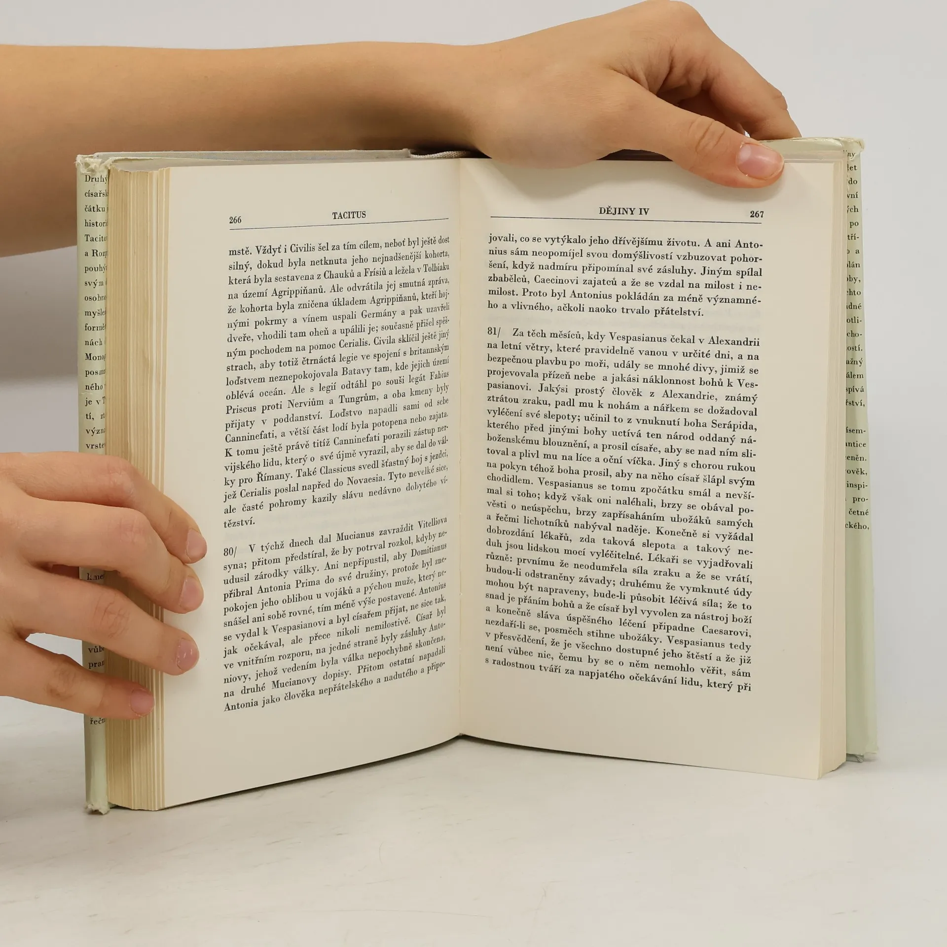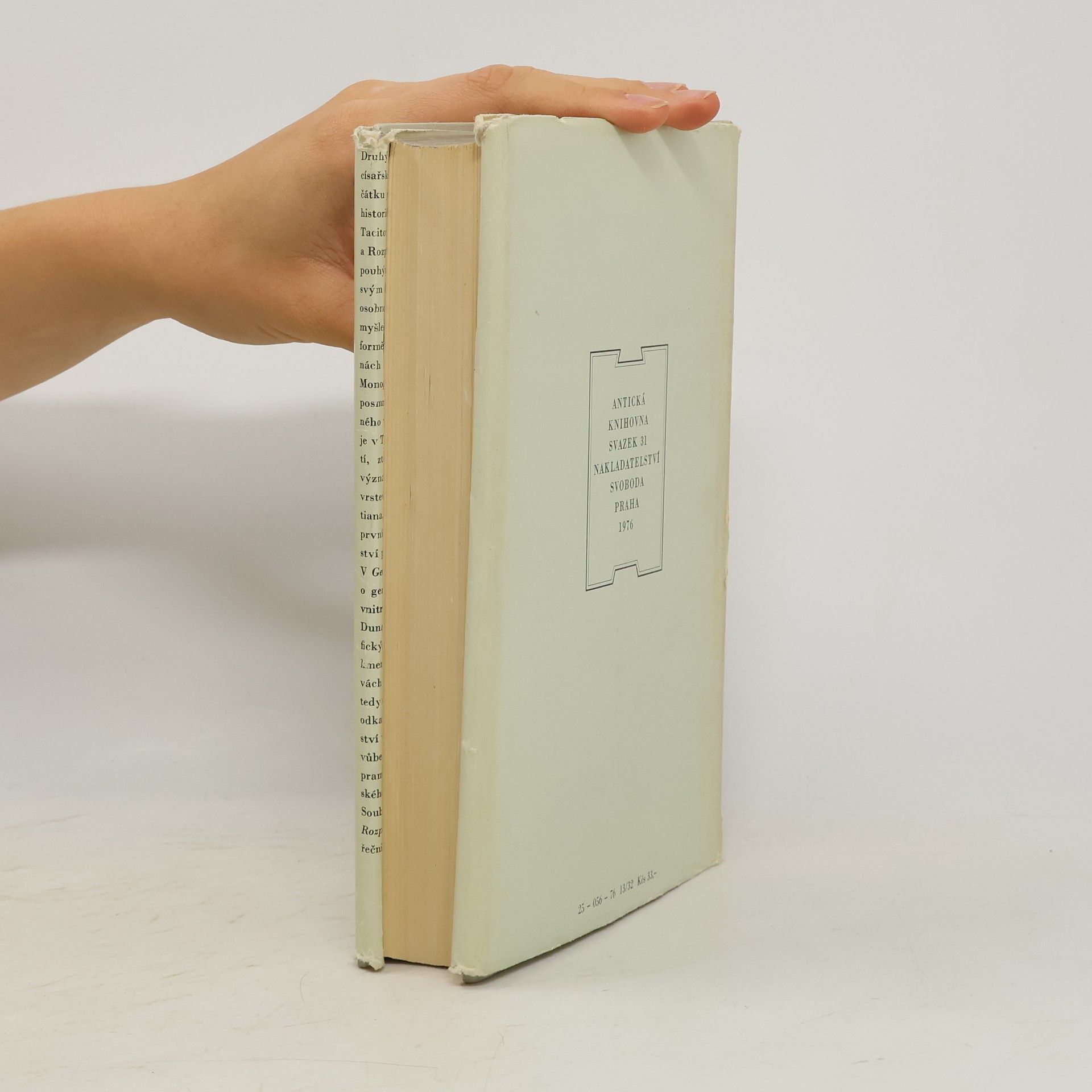 Svazek obsahuje tři drobné práce a Tacitův první velký historický spis, nazvaný Dějiny. Hlavní část svazku vyplňují dochované knihy Dějin, v nichž Tacitus zachytil události v Římě a ve významných částech impéria v době po Neronově smrti až do prohlášení Vespasiana císařem. Kromě Dějin obsahuje svazek drobnějšíTacitovy spisy, jako je chvalořeč na Tacitova tchána Iutia Agricolu, informativní spis o germánských kmenech v evropském vnitrozemí a Rozprava o řečnících, která představuje zajímavou sondu do kulturního života Říma za utužujícíhose principátu. 25-056-76