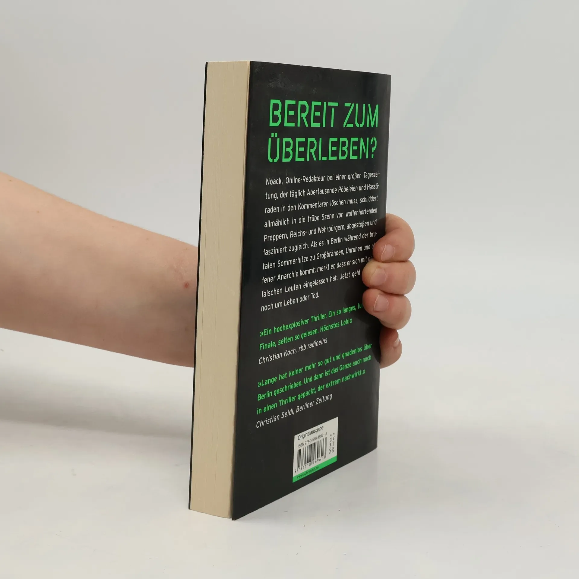 Als Online-Redakteur bei einer großen Tageszeitung muss Walter Noack die Pöbeleien und Hasstiraden in den Kommentaren löschen. Tausende Male am Tag ist er mit den widerwärtigsten Beschimpfungen konfrontiert. Sein Nervenkostüm wird noch dünner, als er und später eine Kollegin von Unbekannten anscheinend grundlos zusammengeschlagen werden und er auch noch einen privaten Verlust erleiden muss. Die Polizei zeigt sich bei all dem machtlos. Das tägliche Gift, der Dauerhass sickert schließlich auch in Noacks Seele. Er schliddert allmählich in die trübe Szene von waffenhortenden Preppers, Reichs-und Wehrbürgern, abgestoßen und fasziniert zugleich. Als es in Berlin während der brutalen Sommerhitze zu Großbränden, Unruhen und offener Anarchie kommt, merkt er, dass er sich mit den falschen Leuten eingelassen hat. Jetzt geht es nur noch um Leben oder Tod.