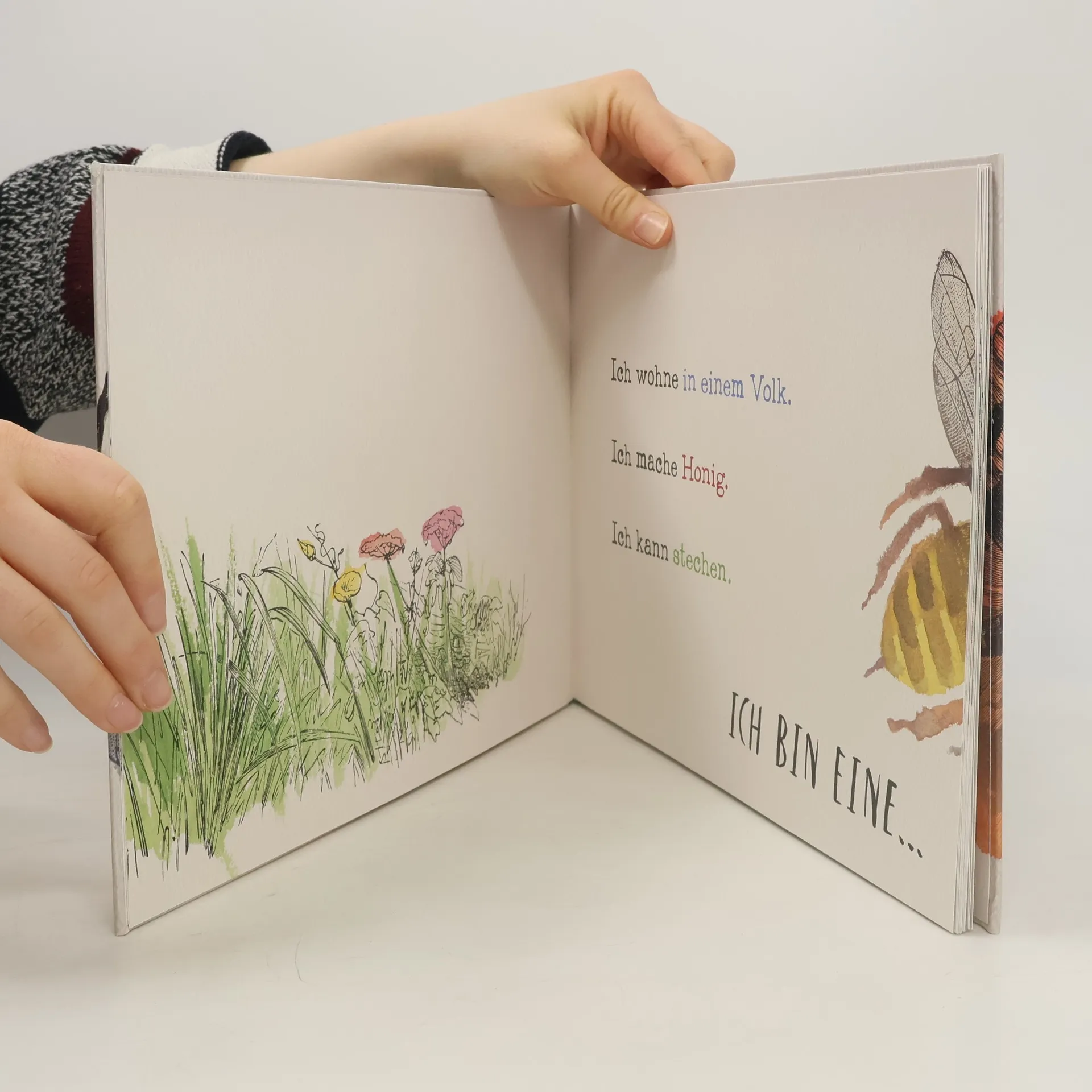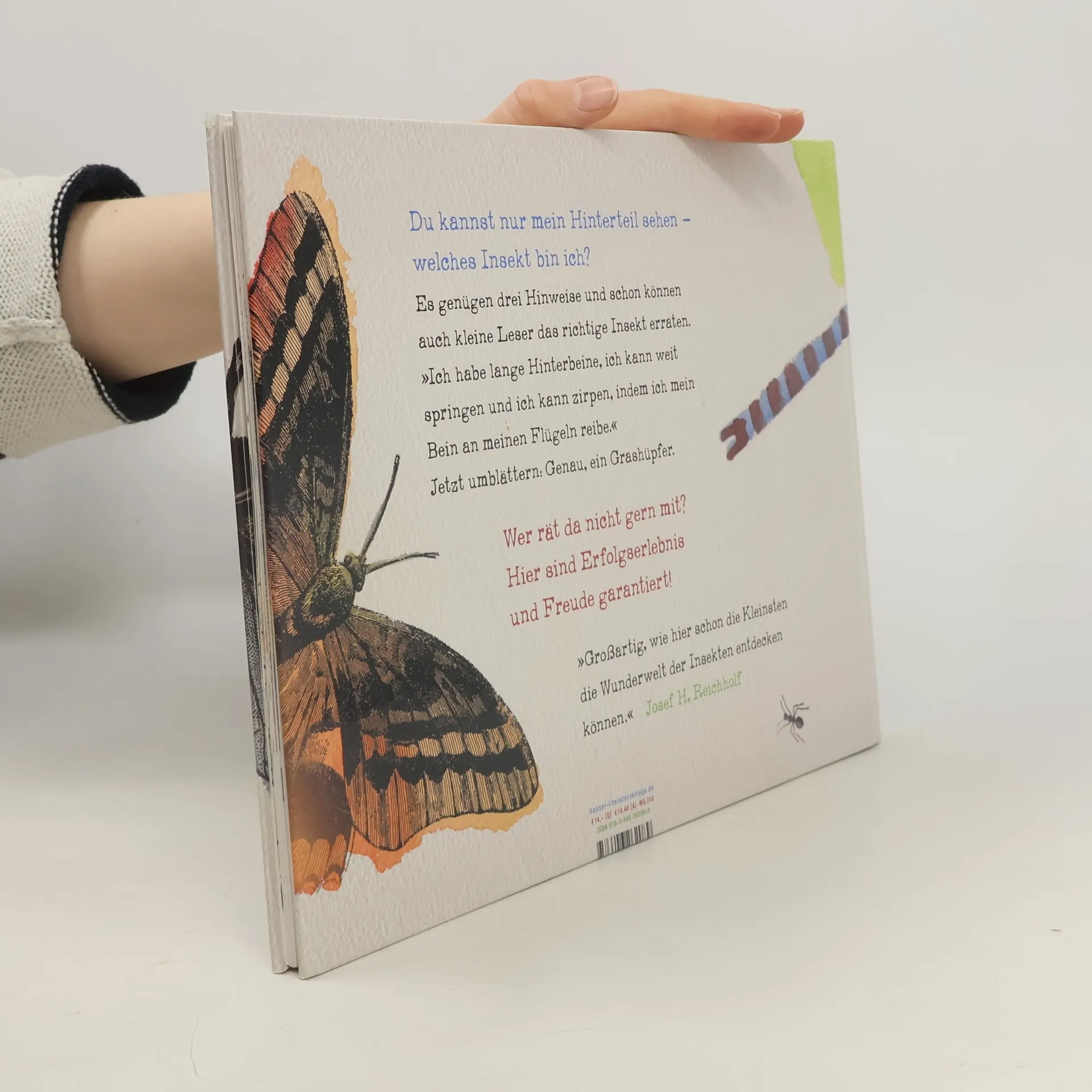 Wer bin ich? Zunächst sieht man nur das Hinterteil, dann genügen drei Hinweise, und schon können auch kleine Leser das richtige Insekt erraten. „Ich habe lange Hinterbeine, ich kann weit springen, und ich kann zirpen, wenn ich mein Bein an meinen Flügeln reibe.“ Jetzt umblättern: Genau, ein Grashüpfer. – Und wer bin ich? „Ich war einmal eine Raupe, doch jetzt habe ich wunderschöne bunte Flügel und flattere von Blüte zu Blüte.“ – John Canty lenkt spielerisch und mit wunderbar zarten Bildern die Aufmerksamkeit auf bekannte Krabbeltiere mit und ohne Flügel. Wer rät da nicht gern mit? Hier sind Erfolgserlebnis und Spaß garantiert!