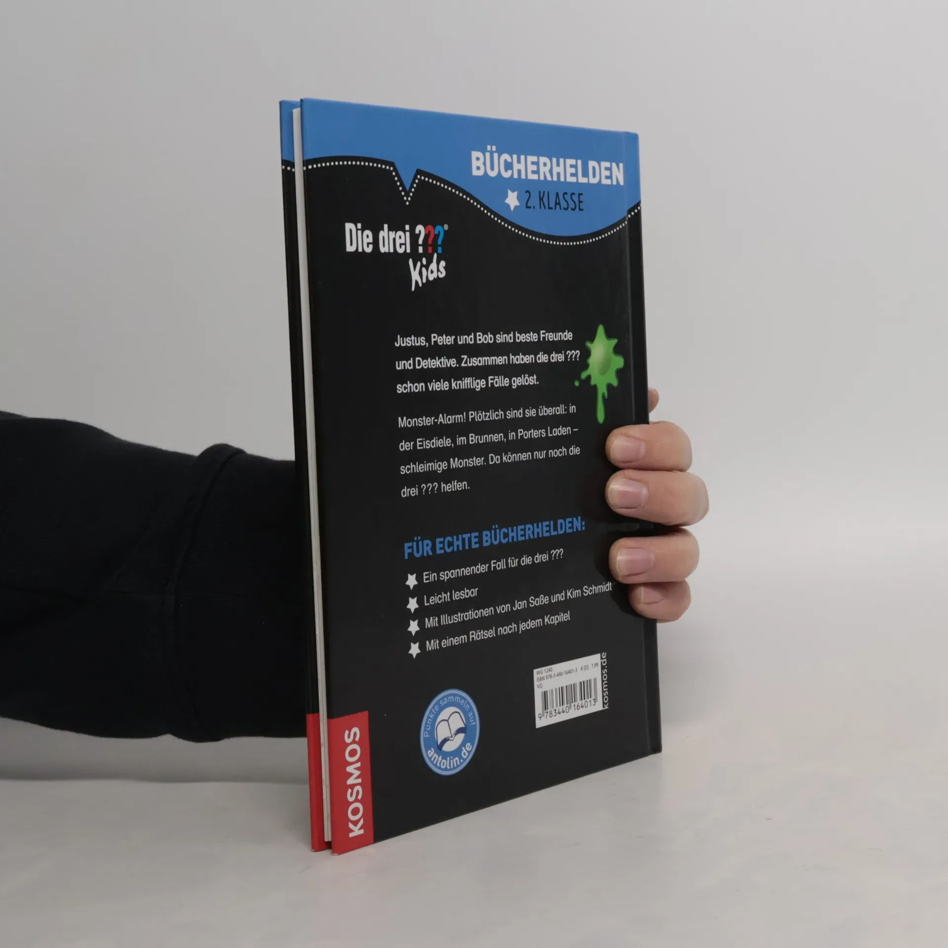 Justus, Peter und Bob sind beste Freunde und Detektive! Zusammen haben die drei ??? schon viele knifflige Fälle gelöst. Monster-Alarm in Rocky Beach! Überall tauchen sie plötzlich auf: in der Eisdiele, im Brunnen – schleimige Monster. Justus, Peter und Bob merken schnell: das ist alles nur ein PR-Gag für den neuen Kinofilm „Monsterjäger“. Doch dann gehen die Monster plötzlich auf Diebestour und die drei ??? Kids müssen doch noch ermitteln… Lesen lernen ist schwer? Nicht mit dieser spannenden Geschichte, die auch Leseanfänger ab Klassenstufe 2 leicht bewältigen können. Illustrationen und ein Leserätsel am Ende jedes Kapitels machen den Band abwechslungsreich, sorgen für Erfolgserlebnisse und erhöhen die Lesemotivation. So macht der Einstieg ins selbstständige Bücherlesen einfach Spaß.