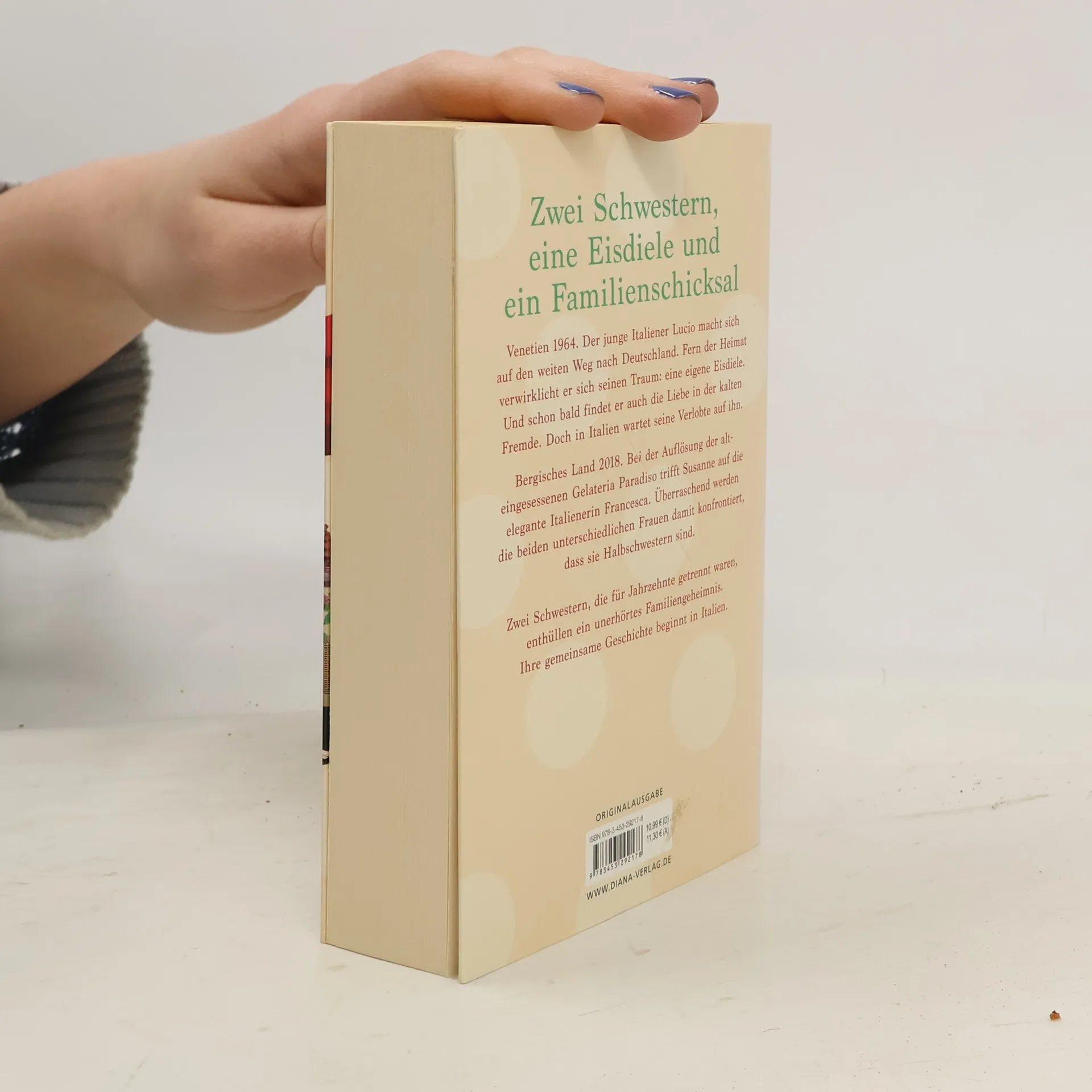 Venezien, 1964: Der junge Italiener Lucio macht sich auf den weiten Weg nach Deutschland. Fern der Heimat verwirklicht er sich seinen Traum: eine eigene Eisdiele. Und schon bald findet er auch die Liebe in der kalten Fremde. Doch in Italien wartet seine Verlobte auf ihn. Bergisches Land, 2018: Bei der Auflösung der alteingesessenen Gelateria Paradiso trifft Susanne auf die elegante Italienerin Francesca. Überraschend werden die beiden so unterschiedlichen Frauen damit konfrontiert, dass sie Halbschwestern sind. Zwei Schwestern, die für Jahrzehnte getrennt waren, decken das Geheimnis ihres Vaters auf. Ihre gemeinsame Geschichte beginnt in Italien.