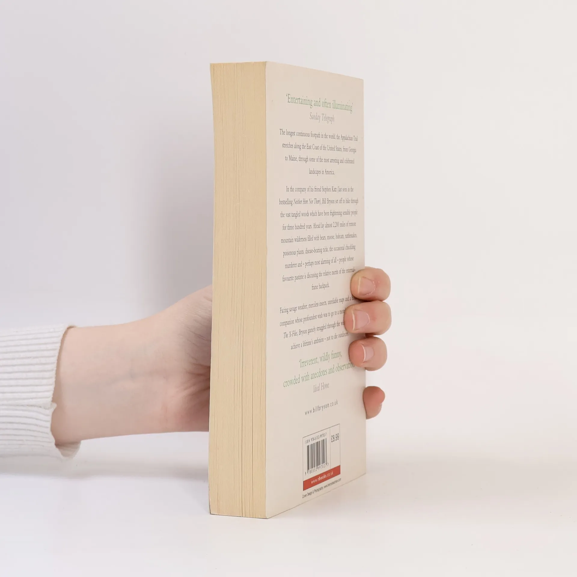 The longest continuous footpath in the world, the Appalachian Trail stretches along the East Coast of the United States, from Georgia to Maine, through some of the most arresting and celebrated landscapes in America. At the age of forty-four, in the company of his friend Stephen Katz (last seen in the bestselling Neither Here nor There), Bill Bryson set off to hike through the vast tangled woods which have been frightening sensible people for three hundred years. Ahead lay almost 2,200 miles of remote mountain wilderness filled with bears, moose, bobcats, rattlesnakes, poisonous plants, disease-bearing tics, the occasional chuckling murderer and - perhaps most alarming of all - people whose favourite pastime is discussing the relative merits of the external-frame backpack. Facing savage weather, merciless insects, unreliable maps and a fickle companion whose profoundest wish was to go to a motel and watch The X-Files, Bryson gamely struggled through the wilderness to achieve a lifetime's ambition - not to die outdoors.