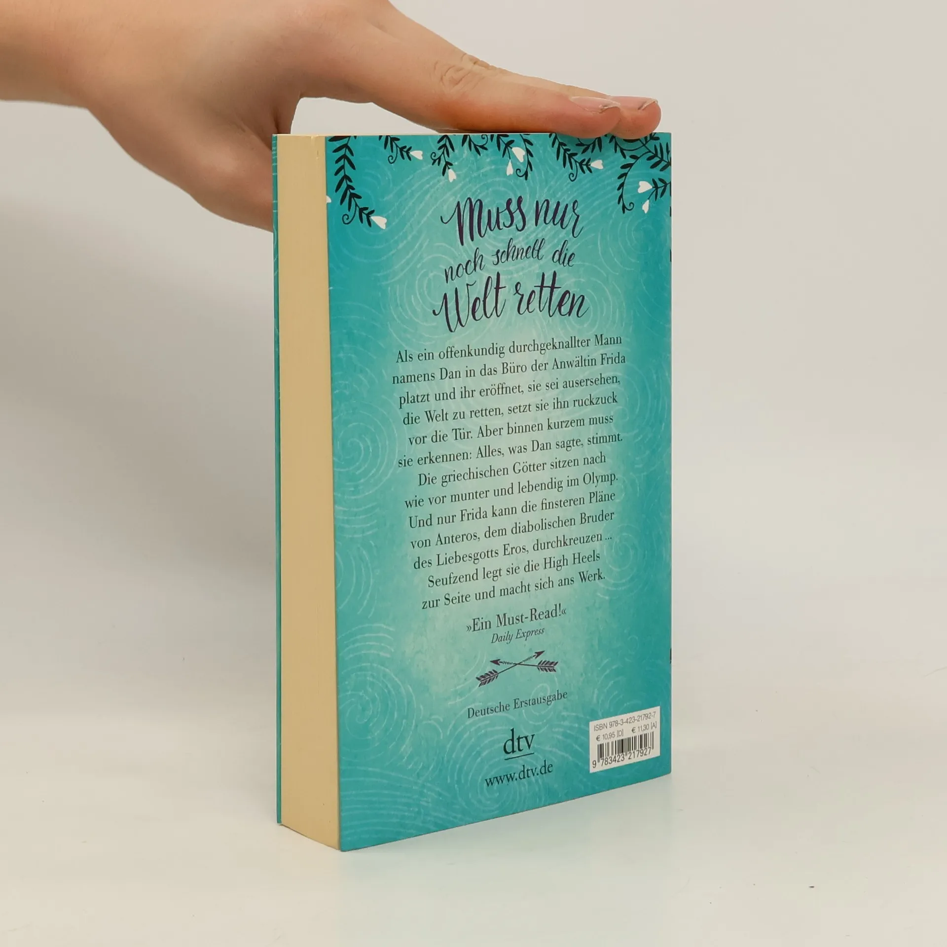 »Muss nur noch kurz die Welt retten.« Als ein scheinbar durchgeknallter Mann namens Dan in das Büro der Anwältin Frida platzt und ihr eröffnet, sie sei dazu ausersehen, die Welt zu retten, setzt sie ihn ruckzuck vor die Tür. Aber dann passieren mysteriöse Dinge − und sie muss der Wahrheit ins Auge blicken: Der attraktive Dan ist tatsächlich das Orakel von Delphi, die griechischen Götter sitzen immer noch munter im Olymp. Und sie ist auserwählt, einen finsteren Plan von Eros' diabolischem Bruder Anteros zu vereiteln und die Welt sowie die Liebe zu retten. Seufzend legt sie die High Heels zur Seite und macht sich ans Werk.