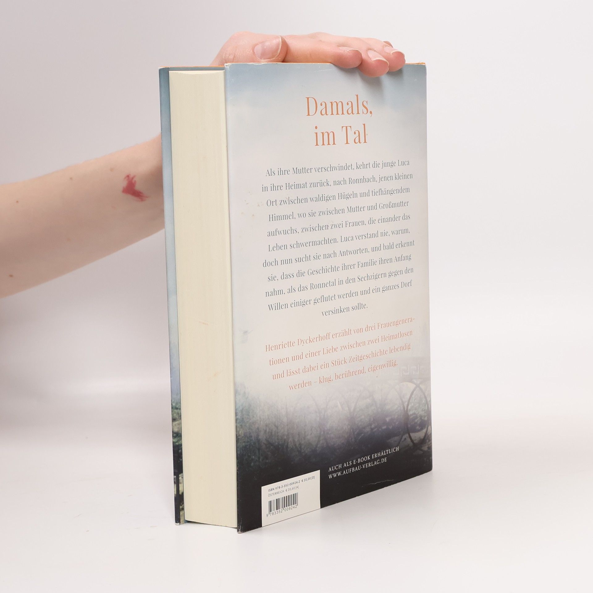Damals, im Tal. Als ihre Mutter verschwindet, kehrt die junge Luca in ihre Heimat zurück, nach Ronnbach, jenen kleinen Ort zwischen waldigen Hügeln und tiefhängendem Himmel, wo sie zwischen Mutter und Großmutter aufwuchs, zwischen zwei Frauen, die einander das Leben schwermachten. Luca verstand nie, warum, doch nun sucht sie nach Antworten, und bald erkennt sie, dass die Geschichte ihrer Familie ihren Anfang nahm, als das Ronnetal in den Sechzigern gegen den Willen einiger geflutet werden und ein ganzes Dorf versinken sollte. Henriette Dyckerhoff erzählt von drei Frauengenerationen und einer Liebe zwischen zwei Heimatlosen und lässt dabei ein Stück Zeitgeschichte lebendig werden – klug, berührend, eigenwillig.