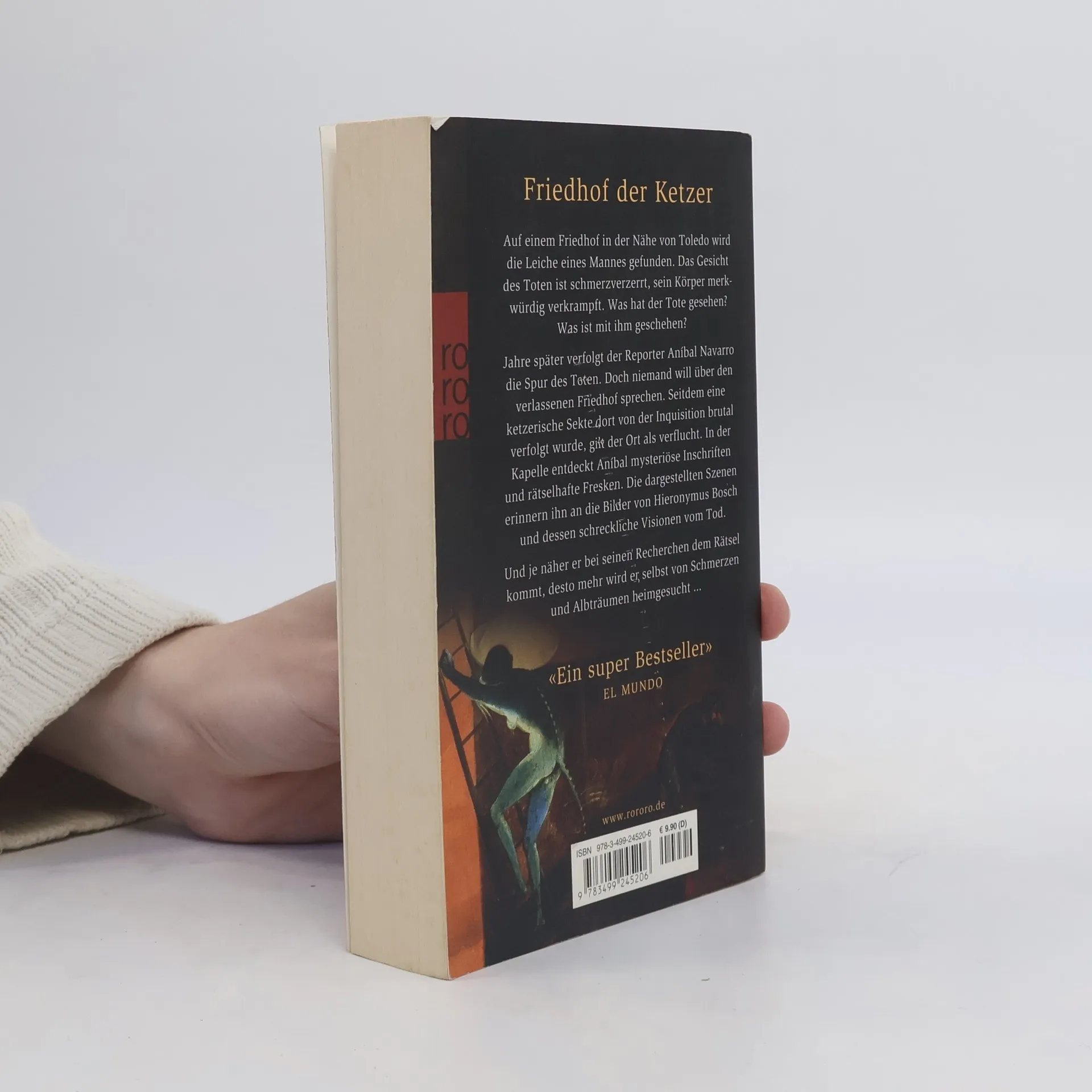 Friedhof der Ketzer Auf einem Friedhof in der Nähe von Toledo wird die Leiche eines Mannes gefunden. Das Gesicht des Toten ist schmerzverzerrt, sein Körper merkwürdig verkrampft. Was hat der Tote gesehen? Was ist mit ihm geschehen? Jahre später verfolgt der Reporter Aníbal Navarro die Spur des Toten. Doch niemand will über den verlassenen Friedhof sprechen. Seitdem eine ketzerische Sekte dort von der Inquisition brutal verfolgt wurde, gilt der Ort als verflucht. In der Kapelle entdeckt Aníbal mysteriöse Inschriften und rätselhafte Fresken. Die dargestellten Szenen erinnern ihn an die Bilder von Hieronymus Bosch und dessen schreckliche Visionen vom Tod. Und je weiter er bei seinen Recherchen dem Rätsel kommt, desto mehr wird er selber von Schmerzen und Alpträumen heimgesucht … „Ein super Bestseller.“ (El Mundo)