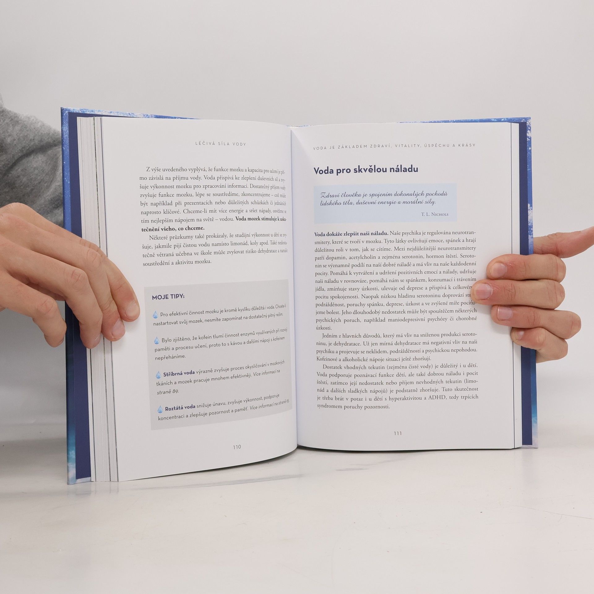 Voda je zdrojem zdraví a vitality a sehrává důležitou roli při léčbě řady nemocí a zdravotních potíží. Tato unikátní publikace známé autorky populárně naučných knih přináší množství cenných informací o vodě, pitném režimu, vodoléčbě a dává odpověď na řadu otázek: Kolik vody a kdy máme pít? Jak poznáme nedostatek vody v těle? Jak zlepšit kvalitu vody z kohoutku? Jak dynamizovat vodu? Umí voda přijímat a přenášet informace? Vzhledem k problematice sucha a nedostatku vody nechybí i praktické rady, jak v domácnosti šetřit pitnou vodou, čímž chráníme životní prostředí a šetříme svoje finance.