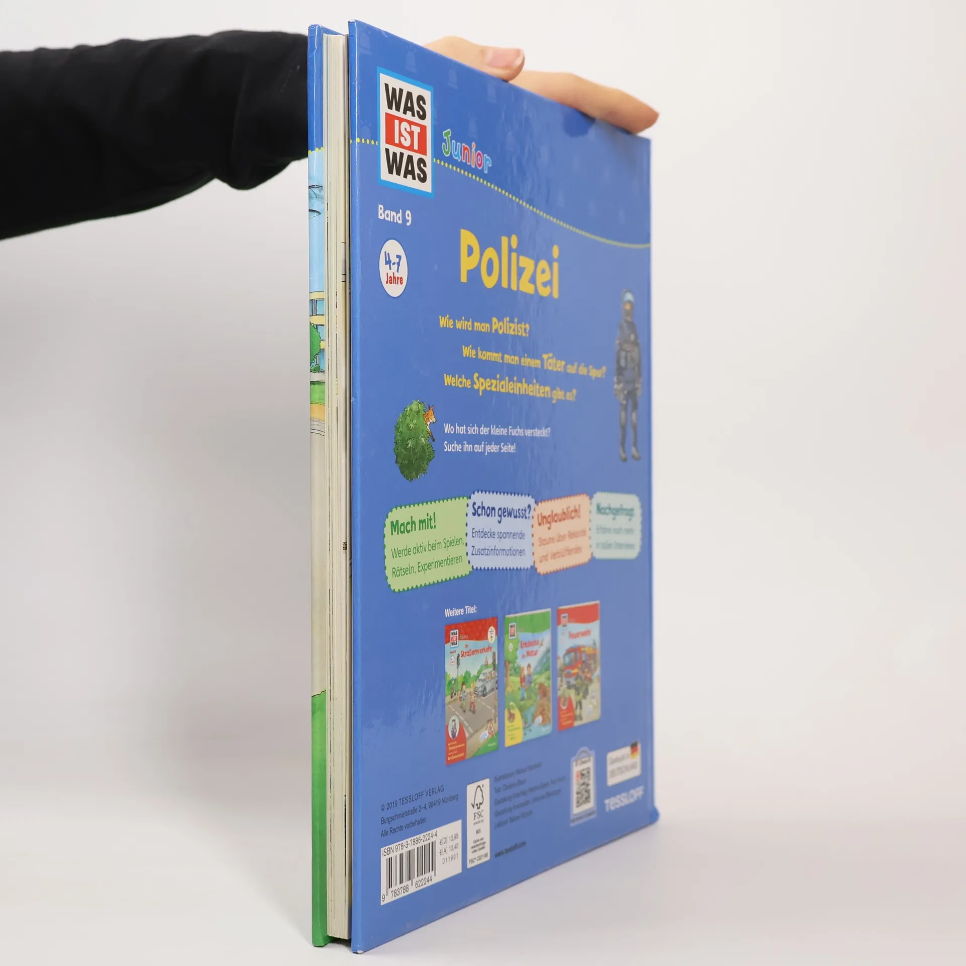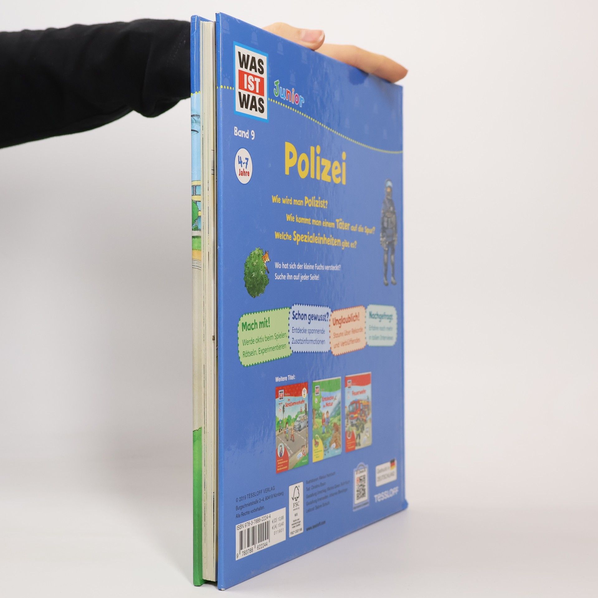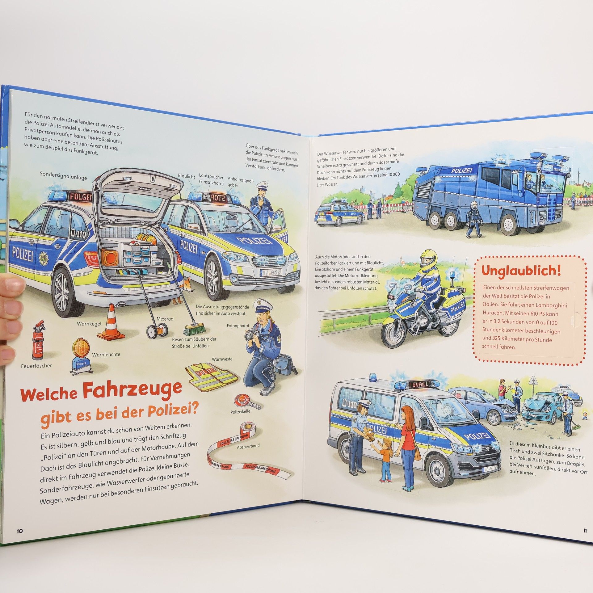 Polizisten „auf Streife“ kennt jedes Kind, genau wie die schnellen Polizeiautos, die mit Blaulicht und Sirene sogar über rote Ampeln fahren dürfen. Neben diesen bekannten Tätigkeitsfeldern der Polizei zeigt dieser Band Kindern ab 4 Jahren aber auch, welche weiteren Aufgaben die Polizei hat, wie es auf der Polizeiwache aussieht und wo sogenannte „Spezialeinheiten“ gebraucht werden. Nach und nach können die kleinen Entdecker mit Hilfe der zahlreichen Klappen immer tiefer ins Geschehen eintauchen. Ein Buch zu einem der absoluten Kinder-Lieblingsthemen, das ganz bestimmt immer wieder gerne zur Hand genommen wird!