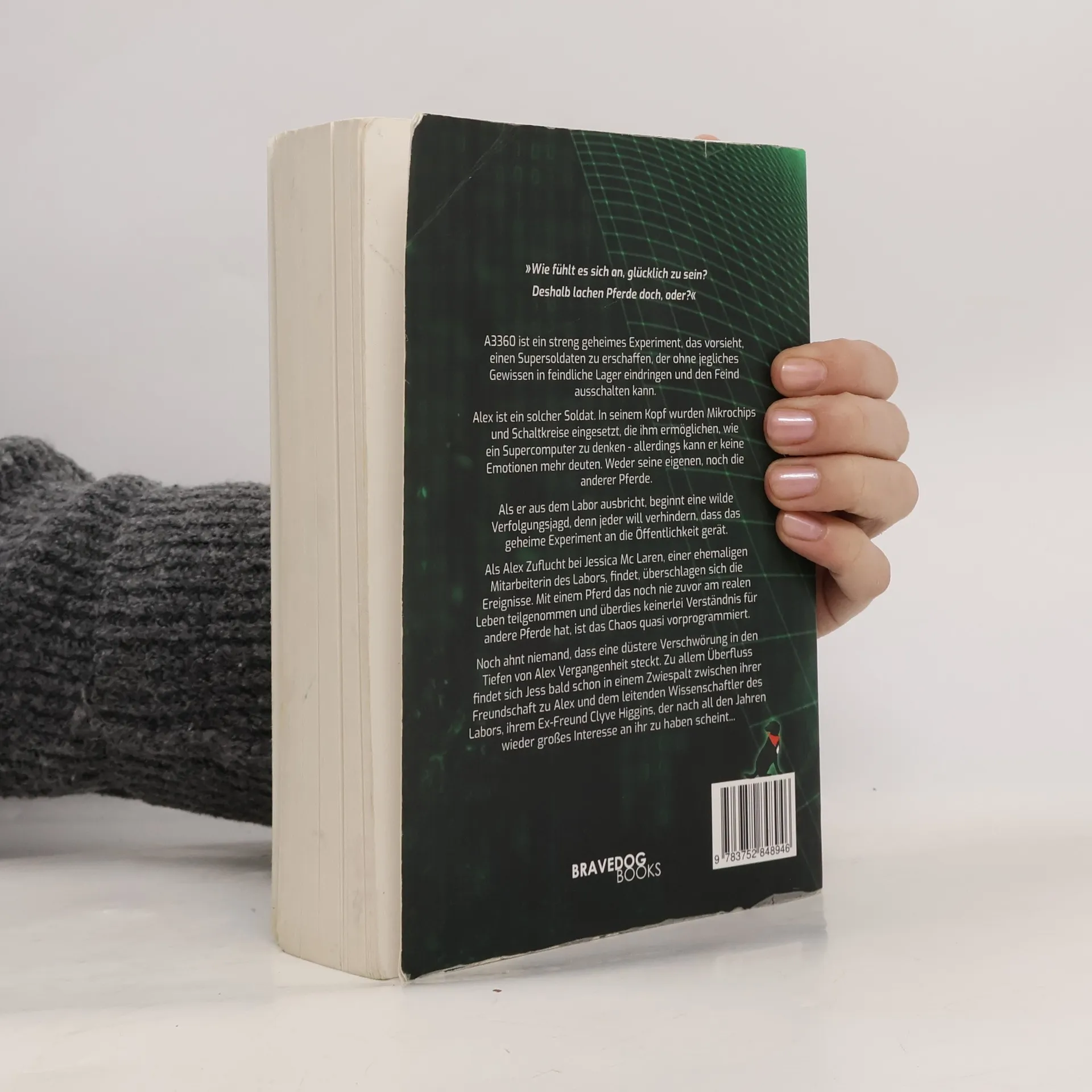 „Wie fühlt es sich an, glücklich zu sein? Deshalb lachen Pferde doch, oder?“ A3360 ist ein streng geheimes Experiment, das vorsieht, einen Supersoldaten zu erschaffen, der ohne jegliches Gewissen in feindliche Lager eindringen und den Feind ausschalten kann. Alex ist ein solcher Soldat. In seinem Kopf wurden Mikrochips und Schaltkreise eingesetzt, die ihm ermöglichen, wie ein Supercomputer zu denken - allerdings kann er keine Emotionen mehr deuten. Weder seine eigenen, noch die anderer Pferde. Als er aus dem Labor ausbricht, beginnt eine wilde Verfolgungsjagd, denn jeder will verhindern, dass das geheime Experiment an die Öffentlichkeit gerät. Als Alex Zuflucht bei Jessica Mc Laren, einer ehemaligen Mitarbeiterin des Labors, findet, überschlagen sich die Ereignisse. Mit einem Pferd das noch nie zuvor am realen Leben teilgenommen und überdies keinerlei Verständnis für andere Pferde hat, ist das Chaos quasi vorprogrammiert. Noch ahnt niemand, dass eine düstere Verschwörung in den Tiefen von Alex Vergangenheit steckt. Zu allem Überfluss findet sich Jess bald schon in einem Zwiespalt zwischen ihrer Freundschaft zu Alex und dem leitenden Wissenschaftler des Labors, ihrem Ex-Freund Clyve Higgins, der nach all den Jahren wieder großes Interesse an ihr zu haben scheint...