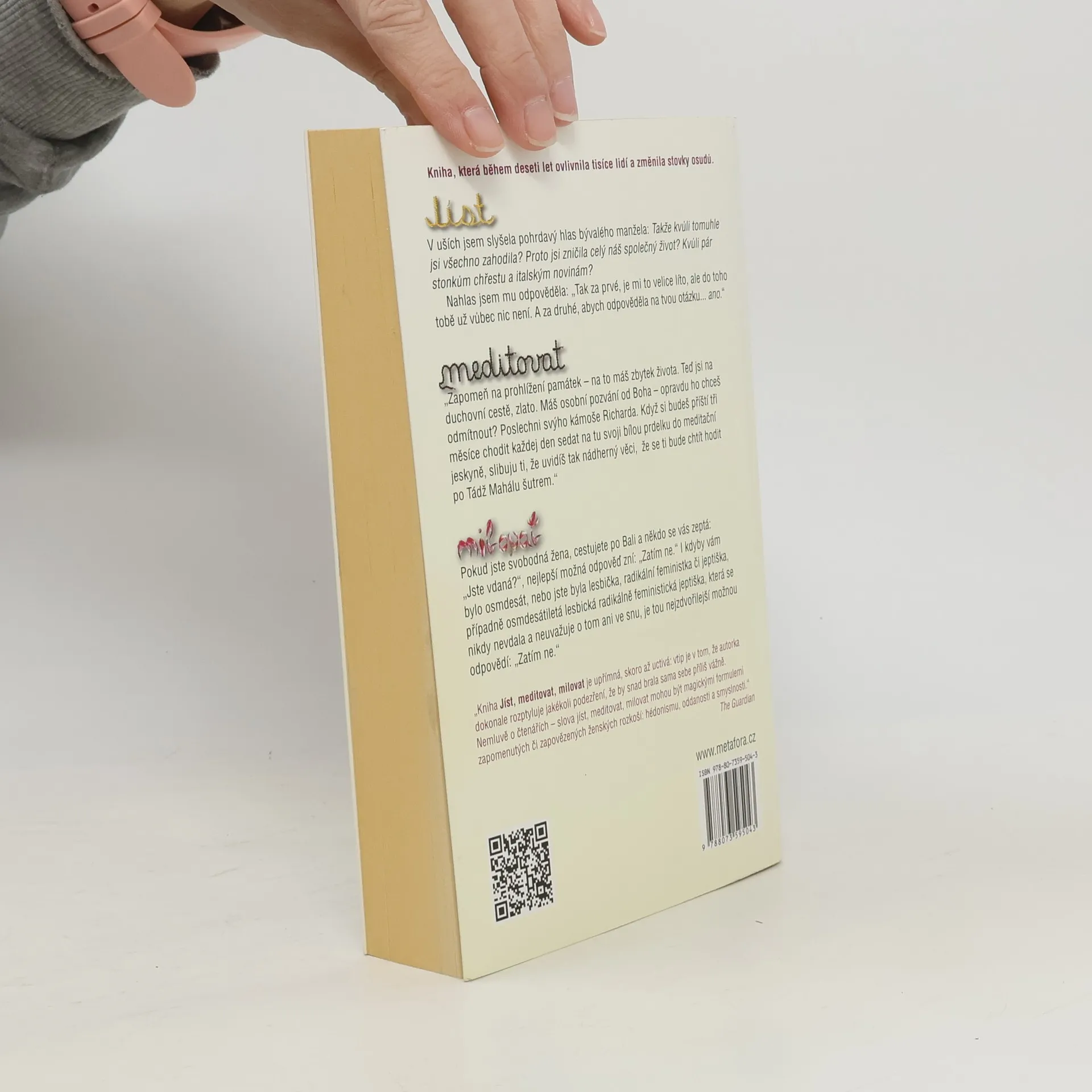 NOVĚ K 10. VÝROČÍ PRVNÍHO VYDÁNÍ. Pouť mladé dámy za pozemskými i duchovními rozkošemi napříč Itálií, Indií a Indonésií... Nové, doplněné vydání knižního (a filmového) bestselleru. Elizabeth má vše, co se od moderní Američanky očekává: manžela, dům a úspěšnou kariéru. Jenže místo aby se cítila šťastná, pohlcuje ji panika, zoufalství a zmatek. Odhodlá se tedy k radikálnímu kroku. Úplně sama se vydá na roční pouť kolem světa. V Itálii studuje umění rozkoše, flirtuje, nezřízeně hoduje a přibere deset nejšťastnějších kilogramů svého života. V Indii absolvuje čtyřměsíční duchovní cestu do vlastního nitra, na níž nechybí ani tak zdánlivé protiklady, jako je meditace, černý humor, mantry a vize. V Indonésii, kde se stane žačkou svérázného starého šamana, pak hledá svůj konečný cíl: rovnováhu a schopnost vybalancovat si život. JÍST... Kvůli pár stonkům chřestu a italským novinám jsi zničila náš společný život? MEDITOVAT... Uvidíš tak nádherný věci, že se ti bude chtít hodit po Tádž Mahálu šutrem. MILOVAT... Jste-li svobodná žena cestující po Bali, nejlepší odpověď na otázku „Jste vdaná?“, zní: „Zatím ne.“ Podle knihy vznikl rovněž úspěšný film s Julií Roberts v hlavní roli.