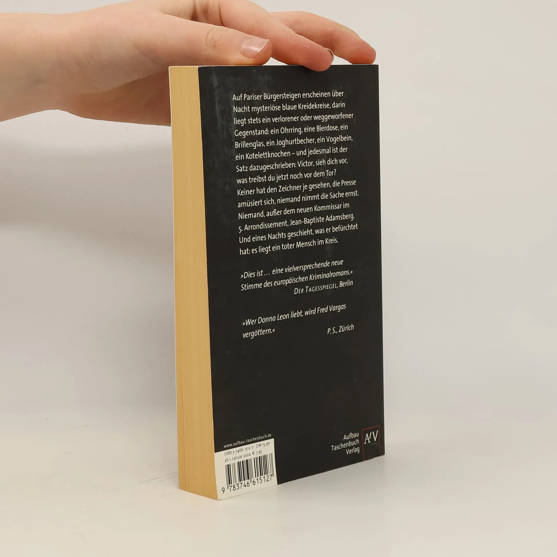 Auf Pariser Bürgersteigen erscheinen über Nacht mysteriöse blaue Kreidekreise, und darin stets ein verlorener oder weggeworfener Gegenstand: ein Ohrring, eine Bierdose, ein Brillenglas, ein Joghurtbecher ... Keiner hat den Zeichner je gesehen, die Presse amüsiert sich, niemand nimmt die Sache ernst. Niemand, außer dem neuen Kommissar im 5. Arrondissement, Jean-Baptiste Adamsberg. Und eines Nachts geschieht, was er befürchtet hat: es liegt ein toter Mensch im Kreidekreis.