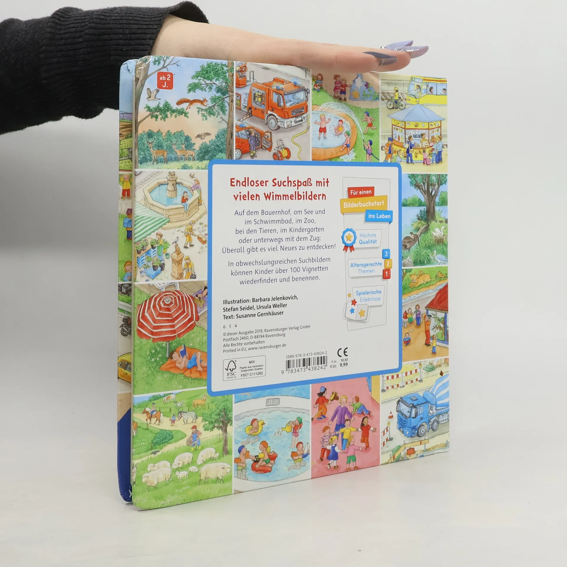 Jede Menge Suchspaß auf 15 Wimmelseiten können Kinder ab 2 Jahren in diesem dicken Buch Sachen suchen. Sie entdecken zum Beispiel den Bauernhof, den Wald, den Spielplatz, das Schwimmbad, den Zoo und viele weitere Orte mehr. Mit über 100 Suchvignetten laden die schönsten Bilder aus der erfolgreichen „Sachen suchen“- Reihe zum ersten Benennen und Erzählen ein. Endloser Suchspaß mit vielen Wimmelbildern! Mit über 100 kleinen Suchbildern wird dieser dicke Sonderband für jeden Fan der „Sachen suchen“- Reihe zum Lieblingsbuch. 15 der beliebtesten Wimmelszenen nehmen die Kinder mit an folgende Orte: BauernhofWaldWieseSchwimmbadSeeKindergarten StreichelzooBaustelleBahnhofÜberall können Kinder ab 2 Jahren auf der Suchleiste zahlreiche Gegenstände benennen und im Bild wiederfinden. Das regt nebenbei auch zum ersten freien Geschichtenerzählen an und fördert so optimal die Sprachentwicklung. Der Jubiläumsband zeigt die schönsten Szenen der Reihe „Sachen suchen“ und ist hochwertig ausgestattet mit einer Buchdecke. Dadurch ist er besonders stabil und langlebig.