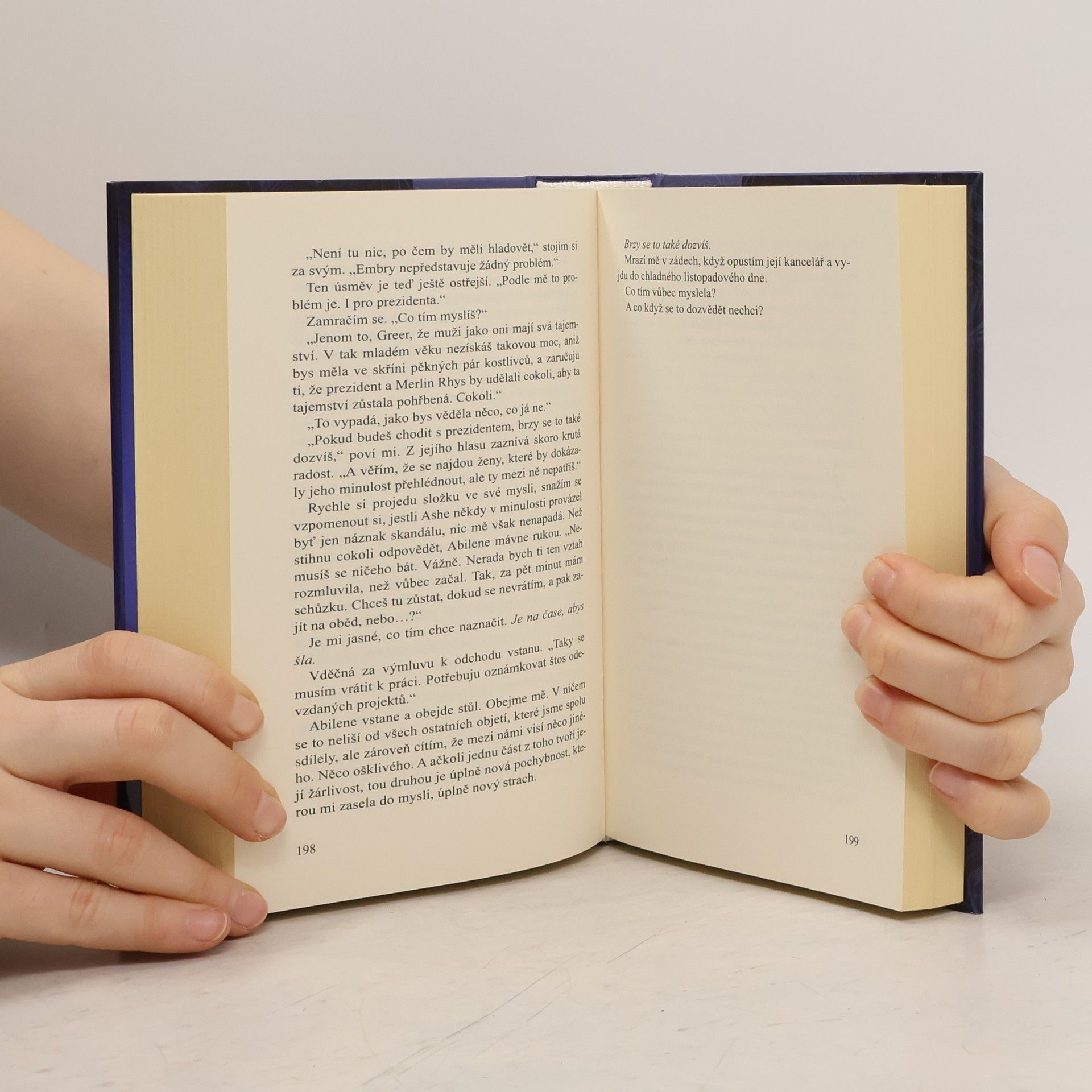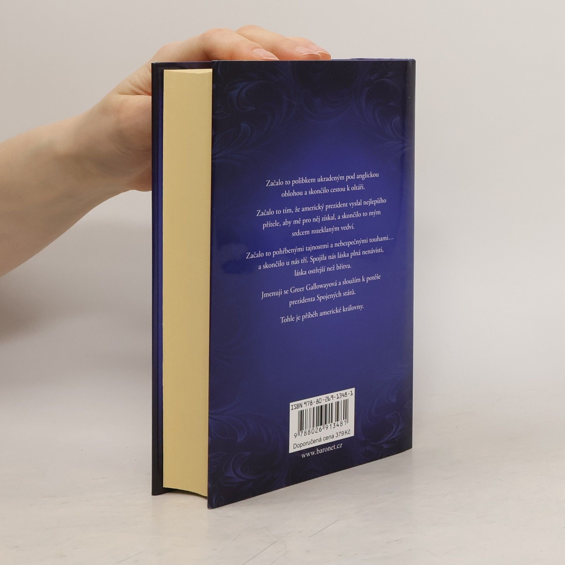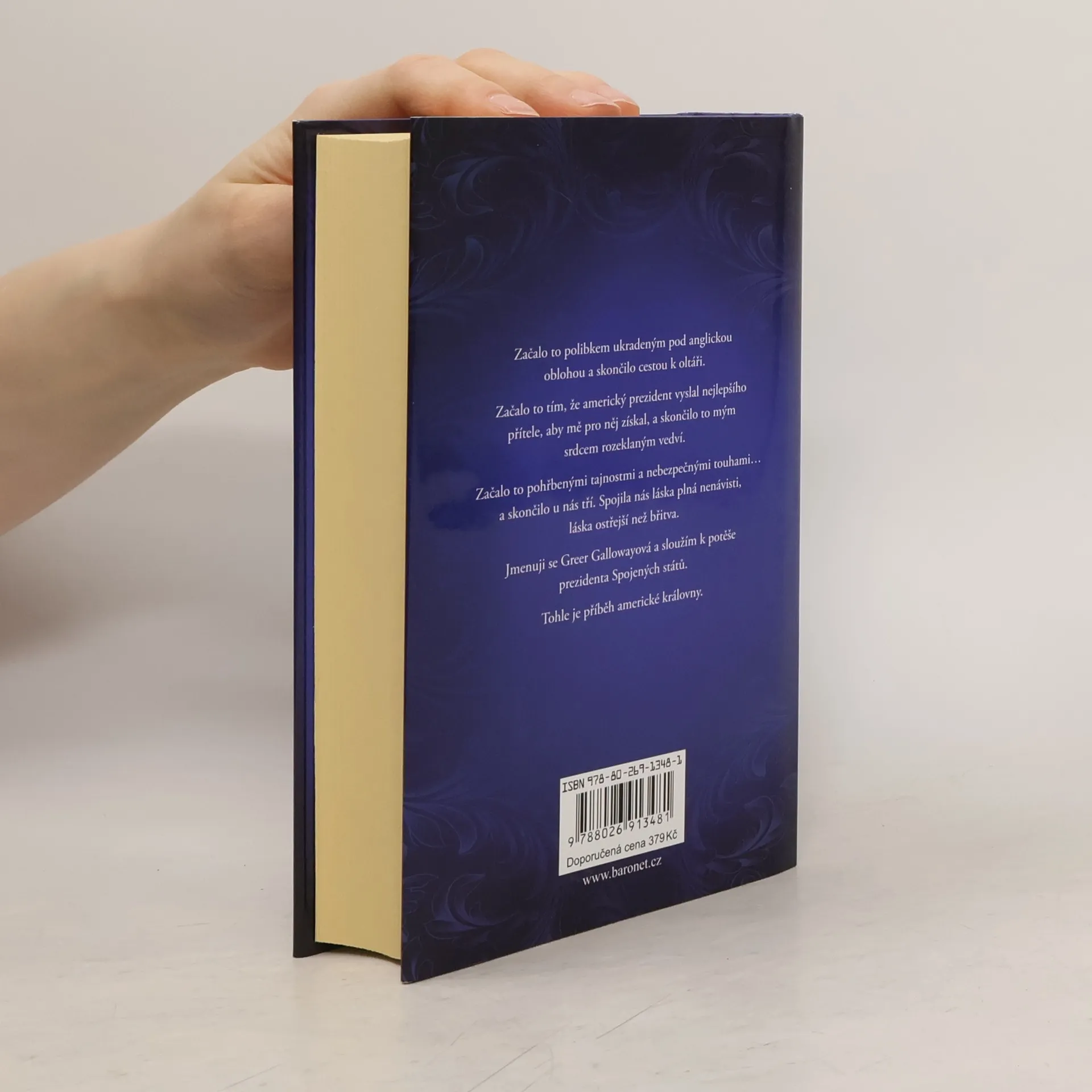 Začalo to polibkem ukradeným pod anglickou oblohou a skončilo cestou k oltáři. Začalo to tím, že americký prezident vyslal nejlepšího přítele, aby mě pro něj získal, a skončilo to mým srdcem rozeklaným vedví. Začalo to pohřbenými tajnostmi a nebezpečnými touhami… a skončilo u nás tří. Spojila nás láska plná nenávisti, láska ostřejší než břitva. Jmenuji se Greer Gallowayová a sloužím k potěše prezidenta Spojených států. Tohle je příběh americké královny.