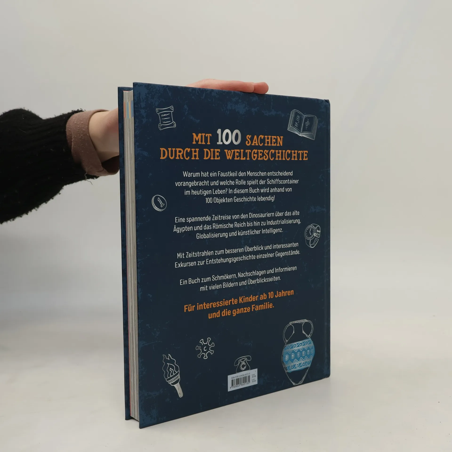 Die Welt erklärt mit 100 Sachen Warum hat ein Faustkeil den Menschen entscheidend vorangebracht und welche Rolle spielt der Schiffscontainer im heutigen Leben? In diesem Buch wird anhand von 100 Objekten Geschichte lebendig. Von den Ursprüngen der Menschen bis heute. Es werden nicht nur die Hintergründe der einzelnen Gegenstände beleuchtet, sondern auch ihre zeitliche Einordnung kommt nicht zu kurz. So werden geschichtliche Zusammenhänge deutlich und ein großes Ganzes entsteht. Alles über die Weltgeschichte: Von der Vorgeschichte bis High-Tech werden die wichtigsten Stationen der Menschheitsgeschichte gezeigt Viele Bilder: Große Fotos machen Geschichte lebendig Spannend recherchiert: Von einem Historiker zusammengestellte Infos Witzige Überblicke: Wie sind die Menschen vor 500 Jahren aufs Klo gegangen? Mehrere Überblicksseiten begleiten Alltagsgegenstände von ihrer Enstehung bis heute Von den Dinos bis heute Ein Buch zum Schmökern, Nachschlagen und Informieren mit vielen Bildern und Überblicksseiten. Für interessierte Kinder ab 10 Jahren