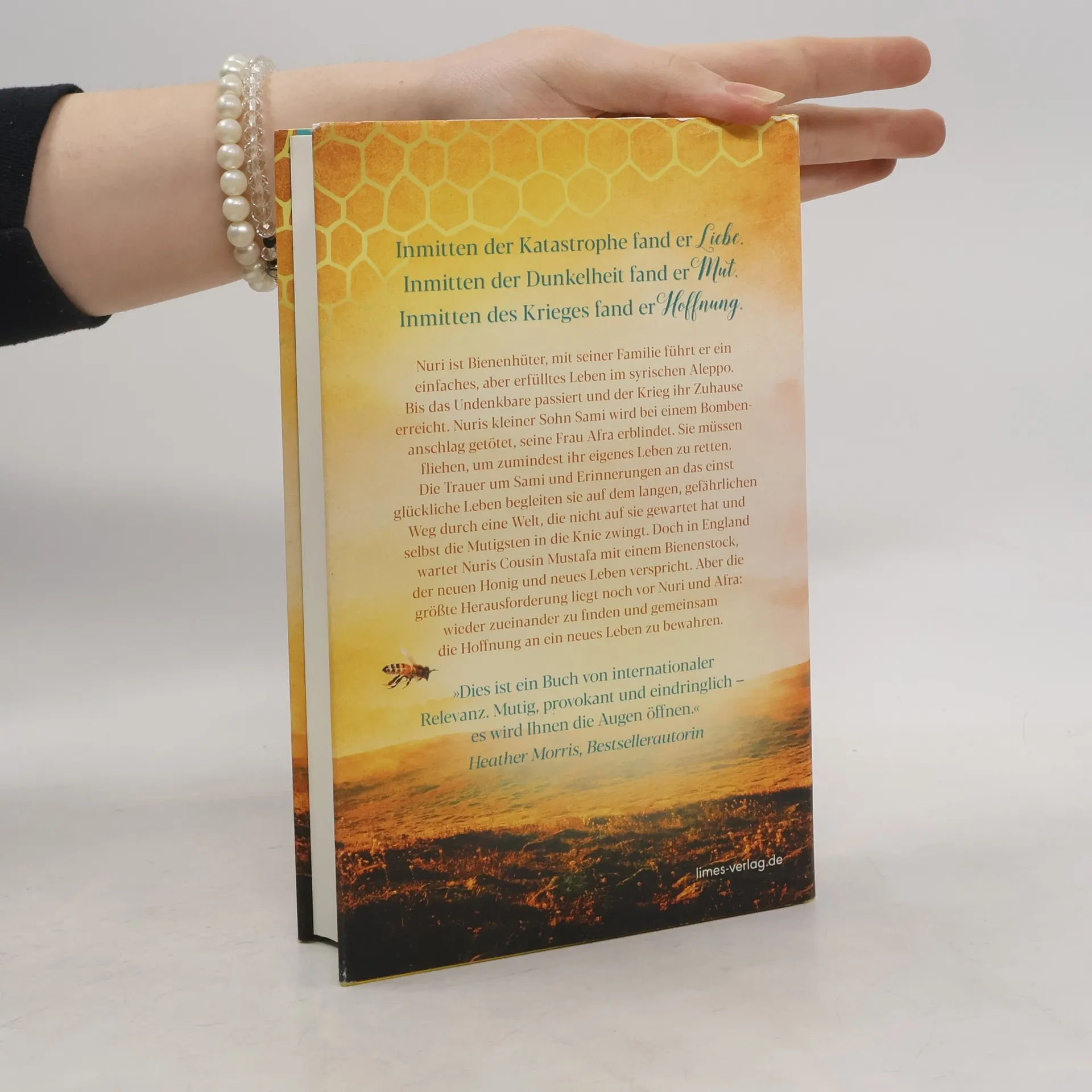 »Nuri und seine Geschichte treffen mitten ins Herz. Wunderbar erzählt, erschütternd und aufrüttelnd.« Belletristik-Couch. de Nuri ist Bienenhüter, mit seiner Familie führt er ein einfaches, aber erfülltes Leben im syrischen Aleppo. Bis das Undenkbare passiert und der Krieg ihr Zuhause erreicht. Nuris kleiner Sohn Sami wird bei einem Bombenanschlag getötet, seine Frau Afra erblindet. Sie müssen fliehen, um zumindest ihr eigenes Leben zu retten. Die Trauer um Sami und Erinnerungen an das einst glückliche Leben begleiten sie auf dem langen, gefährlichen Weg durch eine Welt, die nicht auf sie gewartet hat und selbst die Mutigsten in die Knie zwingt. Doch in England wartet Nuris Cousin Mustafa mit einem Bienenstock, der neuen Honig und neues Leben verspricht. Aber die größte Herausforderung liegt noch vor Nuri und Afra: wieder zueinander zu finden und gemeinsam die Hoffnung an ein neues Leben zu bewahren.Sie haben alles verloren und glauben dennoch an einen Neuanfang: Diese Geschichte wird Sie berühren, mitreißen und doch hoffnungsvoll zurücklassen.