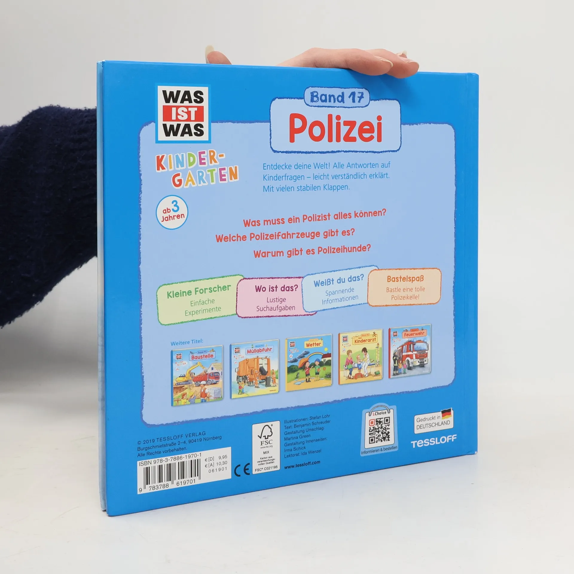 Im Kindergarten dreht sich diese Woche alles um das faszinierende Thema Polizei. Die Mädchen und Jungen wollen in Erfahrung bringen: Was muss ein Polizist können? Wie sieht es auf einer Polizeiwache aus? Welche Ausrüstung hat ein Polizist? In leicht verständlichen Texten und mit detailgetreuen Bildern erfahren Kindergartenkinder, dass sie die 110 wählen müssen, wenn sie Hilfe benötigen, wie sie den eigenen Fingerabdruck sichtbar machen können oder wann die Polizei Blaulicht und Martinshorn einsetzt. Stabile Klappen auf jeder Seite geben weitere Einblicke in den Alltag auf einer Polizeiwache, zeigen das Innere eines Polizeiwagens oder was beim Hundetraining passiert.