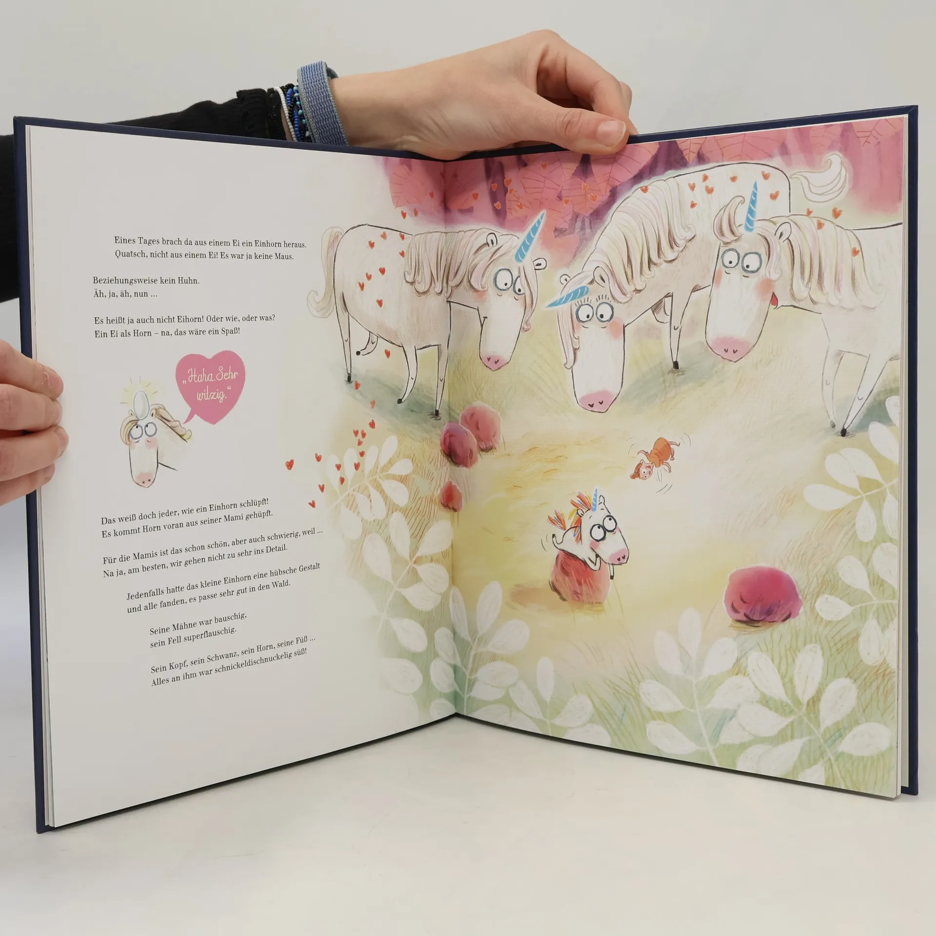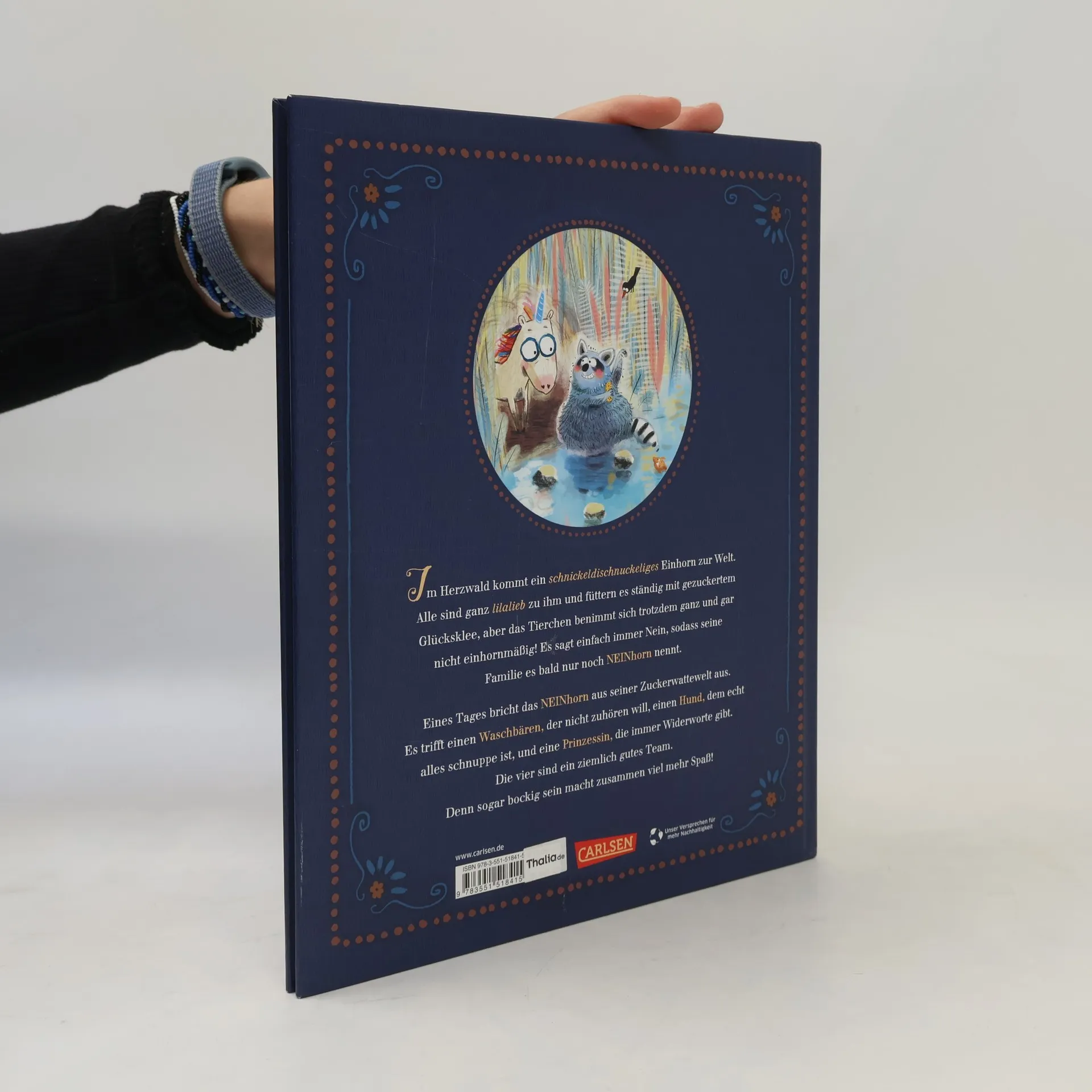 Im Herzwald kommt ein kleines, schnickeldischnuckeliges Einhorn zur Welt. Aber obwohl alle ganz lilalieb zu ihm sind und es ständig mit gezuckertem Glücksklee füttern, benimmt sich das Tierchen ganz und gar nicht einhornmäßig. Es sagt einfach immer Nein, sodass seine Familie es bald nur noch NEINhorn nennt. Eines Tages bricht das NEINhorn aus seiner Zuckerwattewelt aus. Es trifft einen Waschbären, der nicht zuhören will, einen Hund, dem echt alles schnuppe ist, und eine Prinzessin, die immer Widerworte gibt. Die vier sind ein ziemlich gutes Team. Denn sogar bockig sein macht zusammen viel mehr Spaß!