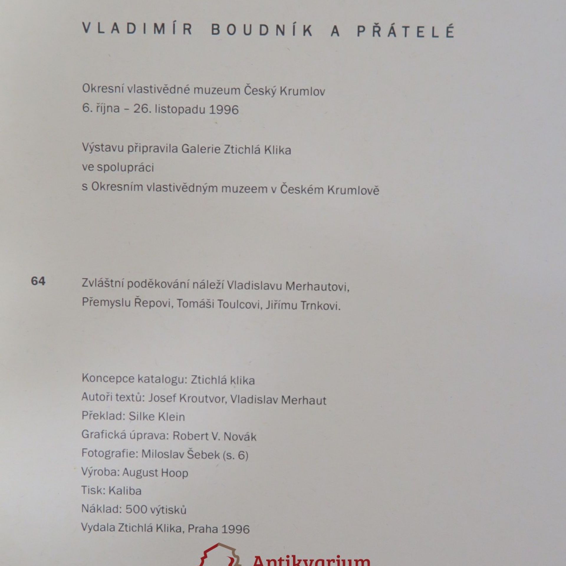 Vladimír Boudník : Okresní vlastivědné muzeum Český Krumlov, 6. října - 26. listopadu 1996, Vladimír Boudník, Josef Kroutvor, Vladislav Merhaut