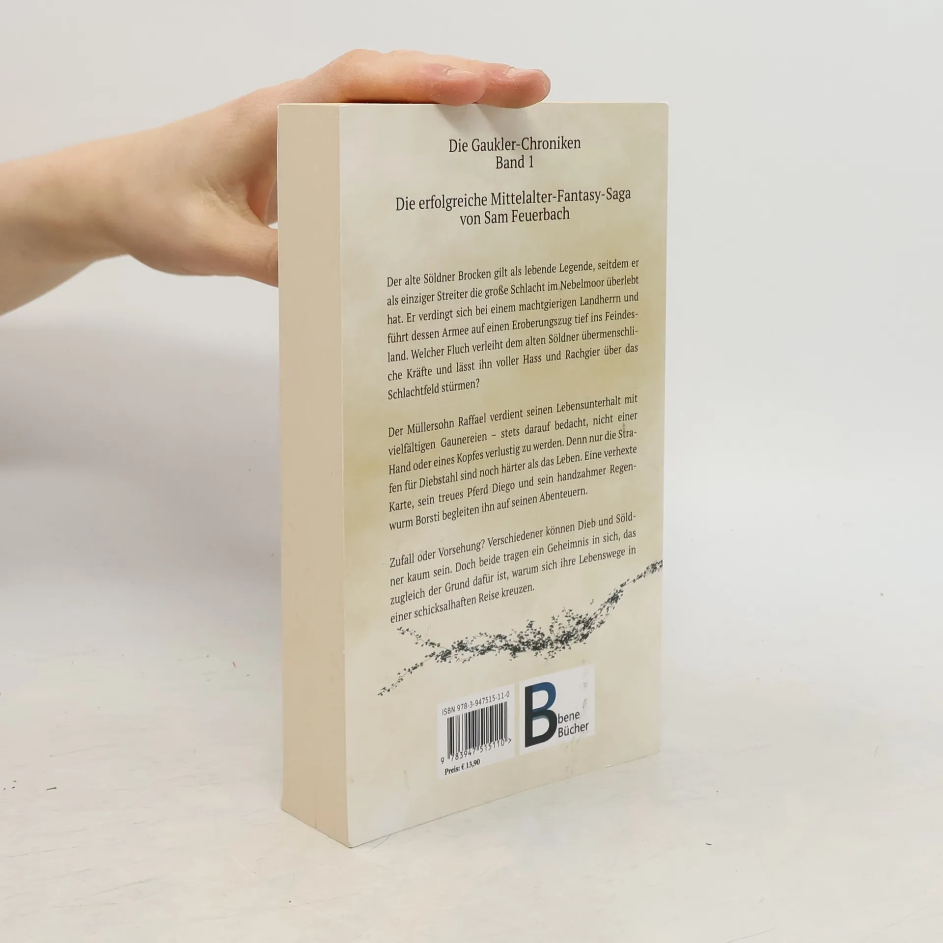 Die neue Mittelalter-Fantasy-Saga von Sam Feuerbach Der alte Söldner Brocken gilt als lebende Legende, seitdem er als einziger Streiter die große Schlacht im Nebelmoor überlebt hat. Er verdingt sich bei einem machtgierigen Landherrn und führt dessen Armee auf einen Eroberungszug tief ins Feindesland. Welcher Fluch verleiht dem alten Söldner übermenschliche Kräfte und lässt ihn voller Hass und Rachgier über das Schlachtfeld stürmen? Der Müllersohn Raffael verdient seinen Lebensunterhalt mit vielfältigen Gaunereien – stets darauf bedacht, nicht einer Hand oder eines Kopfes verlustig zu werden. Denn nur die Strafen für Diebstahl sind noch härter als das Leben. Eine verhexte Karte, sein treues Pferd Diego und sein handzahmer Regenwurm Borsti begleiten ihn auf seinen Abenteuern. Zufall oder Vorsehung? Verschiedener können Dieb und Söldner kaum sein. Doch beide tragen ein Geheimnis in sich, das zugleich der Grund dafür ist, warum sich ihre Lebenswege in einer schicksalhaften Reise kreuzen.