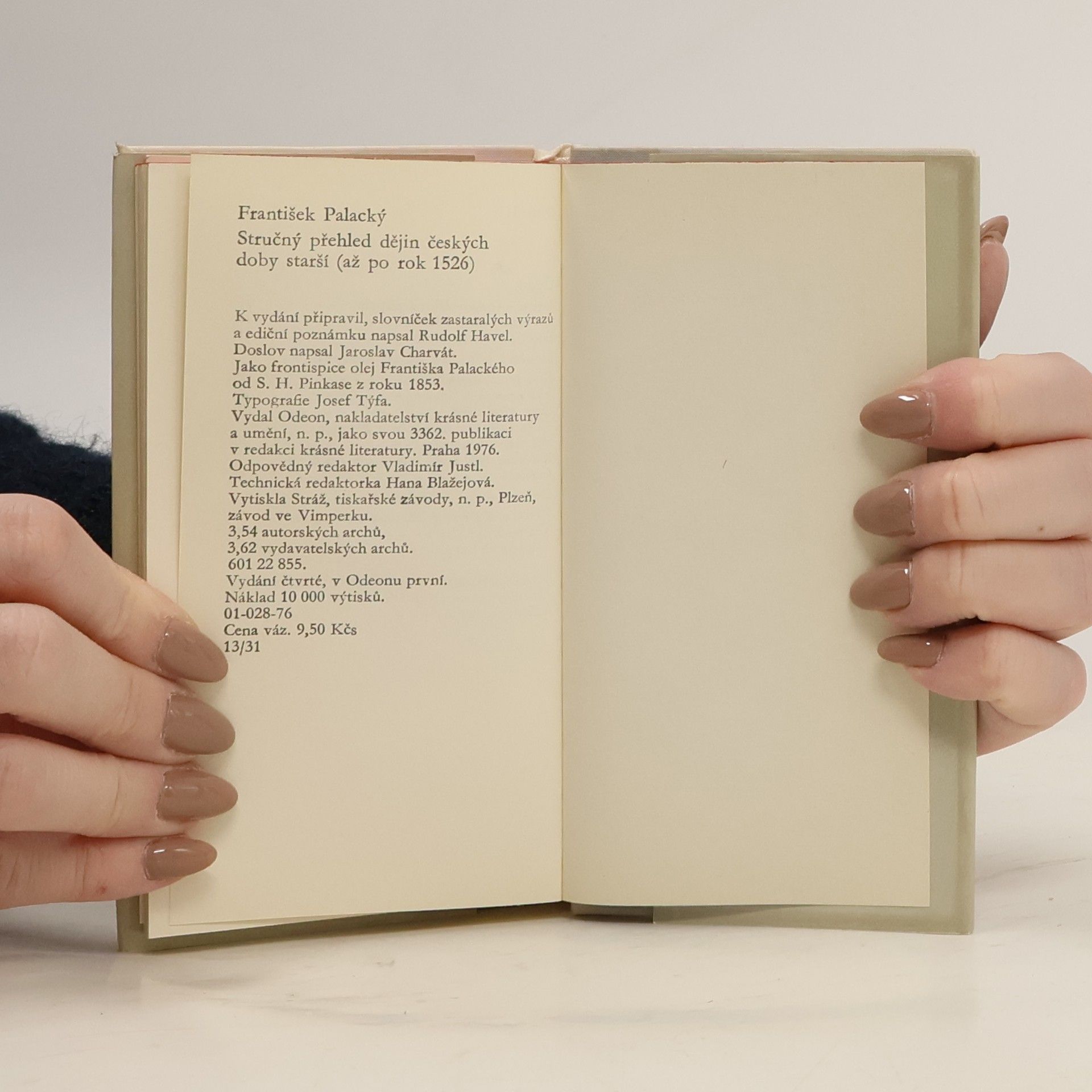 Kniha vyšla k 100. výročí úmrtí Františka Palackého. Jedná se o útlou knížečku nezvyklého formátu (8,5 x 14.5 cm). Kniha obsahuje stručný přehled starých dějin. "Doba předslovanská" "Věk slovanskopohanský", "Čech křesťanské", "Čechy knížecí a královské s převahou ještě řádův slovanských", Královská říše česká s převahou řádův feudálních". Dějiny doby střední "Původ a počátky rozbrojův církevních", "Věk poděbradský", "Věk jagiellovský". Součástí je doslov Jaroslava Charváta a slovníček zastaralých výrazů. V ediční poznámce se píše, že tento stručný přehled byl napsán pro heslo Čechy do Riegrova Slovníku naučného (2.sv.,1861), kde vytvořil první část oddílu Dějepis. Jedná se o přehledný výklad, kterým F.P. mistrně vyjádřil na několika stránkách obsah svého obsáhlého díla, jemuž se věnoval půl století.