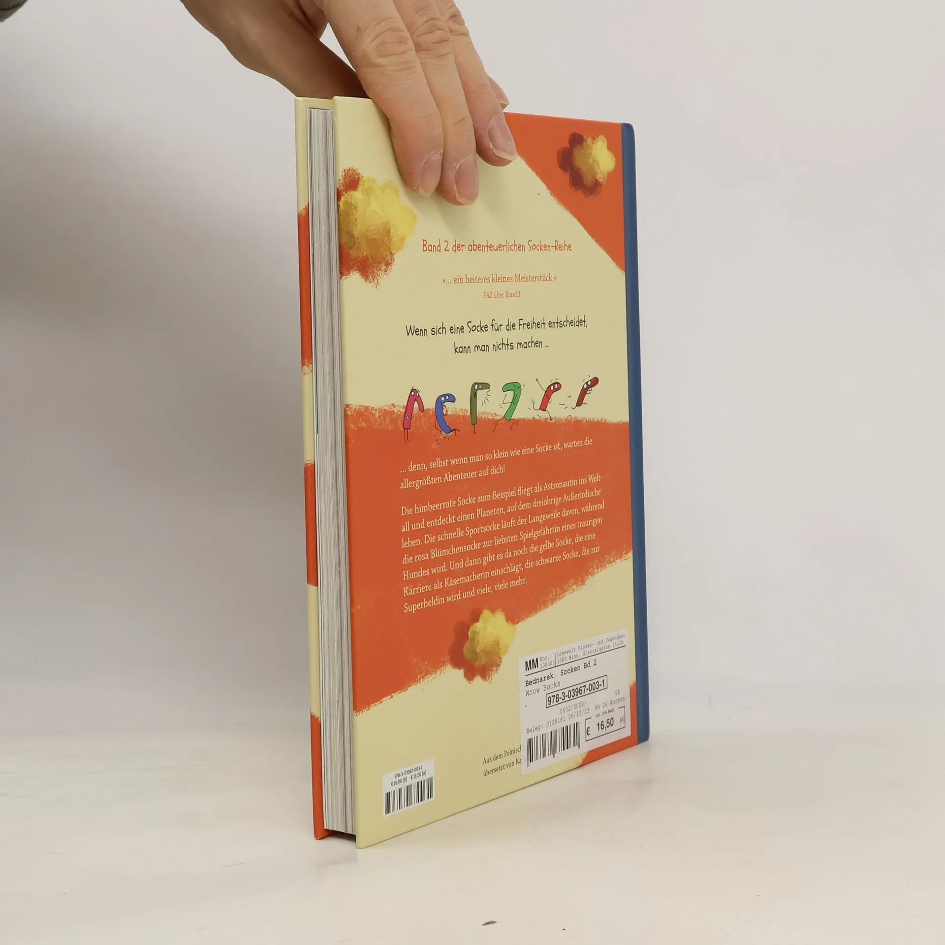Selbst wenn man so klein ist wie eine Socke, kann man die allergrößten Abenteuer erleben! Die himbeerrote Socke fliegt als Astronautin ins Weltall, wo sie einen Planeten entdeckt, auf dem dreiohrige Außerirdische leben. Die einfallsreiche blaue Socke hilft einer berühmten Autorin beim Bücherschreiben, während die rosa Blümchensocke zur liebsten Spielgefährtin eines traurigen Hundes wird. Und dann gibt es da noch die gelbe Socke, die eine Karriere als Käsemacherin einschlägt, die weiße Socke, die einen Job als Gespenst annimmt, und viele, viele mehr. Band 2 der Socken -Reihe