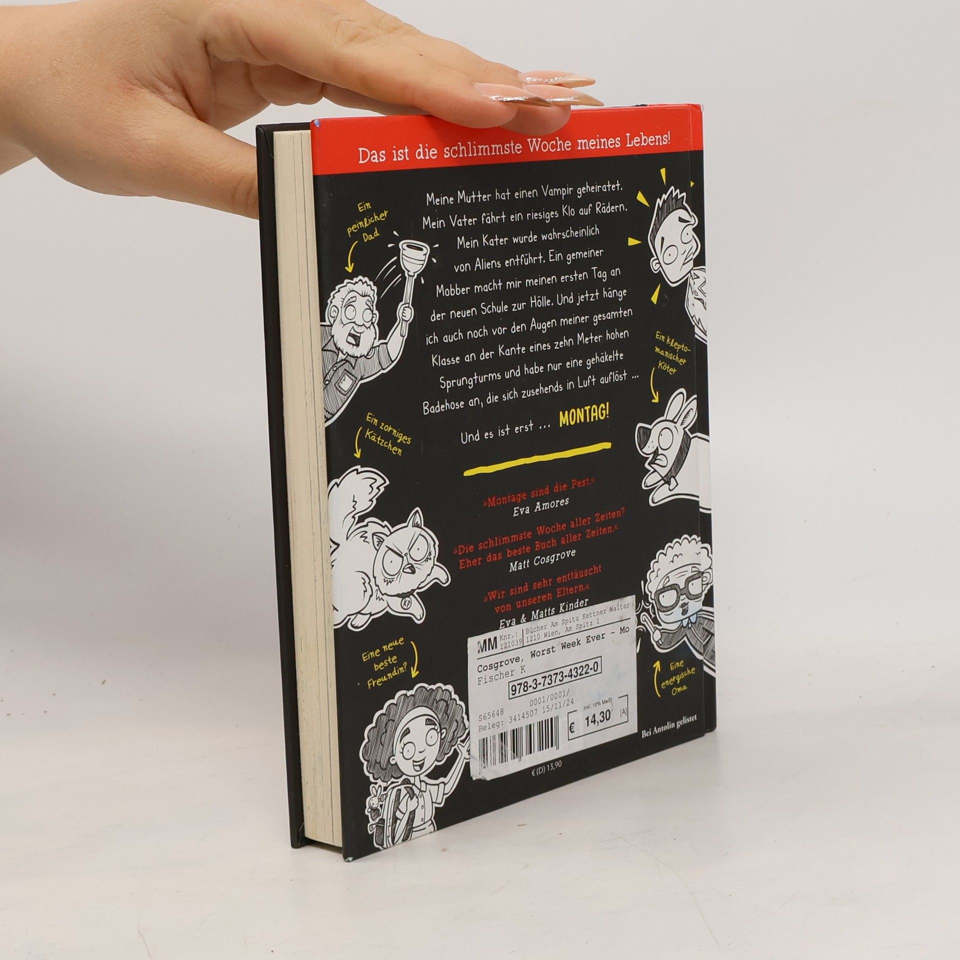 Ein Comic-Roman voller Witz und Lesespaß ! Das australische Autorenduo Eva Amores und Matt Cosgroves haben mit Justin Chase den sympathischsten Kinderbuchhelden aller Zeiten geschaffen. In der siebenteiligen Kinderbuchreihe Worst Week Ever stolpert der Pechvogel von Missgeschick zu Missgeschick – und sorgt damit für jede Menge Lacher. Wer Gregs Tagebuch und Tom Gates mochte, wird den DeinSpiegel-Bestseller Worst Week Ever lieben! MONTAG: Justin hat die schlimmste Woche seines Lebens: Seine Mutter hat einen Vampir geheiratet. Sein Vater fährt ein riesiges Klo auf Rädern. Seine Katze wurde wahrscheinlich von Aliens entführt. Ein fieser Typ macht ihm den ersten Tag an der neuen Schule zur Hölle. Und jetzt hängt Justin auch noch vor den Augen seiner gesamten Klasse an der Kante eines zehn Meter hohen Sprungturms - mit nichts als einer gehäkelten Badehose bekleidet, die sich gerade in Luft auflöst …. Und das ist erst der Montag! Die witzigen Illustrationen auf jeder Seite eignen sich hervorragend für junge Leser*innen. Mit Worst Week Ever werden auch Jungs ab 10 Jahren zu Viellesern ! „Die schlimmste Woche aller Zeiten? Eher das beste Buch aller Zeiten.“ Matt Cosgrove Der Spaß geht weiter – mit den nächsten witzigen Bänden der Kinderbuchreihe: Band 1: Montag Band 2: Dienstag Band 3: Mittwoch erscheint im Frühjahr 2024 Band 4: Donnerstag erscheint im Frühjahr 2024 Serie bei Antolin gelistet