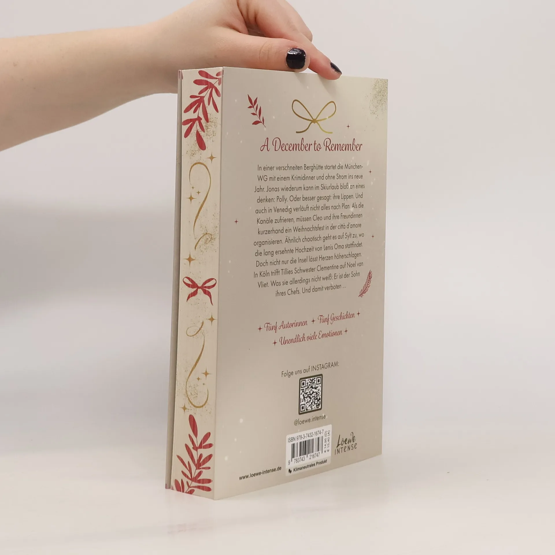 Heiligabend in Venedig oder Silvester in den Bergen? Während die München-WG mit einem Krimidinner und ohne Strom ins neue Jahr startet, denkt Jonas im Skiurlaub nur an Polly und ihre Lippen. In Venedig müssen Cleo, Sofia und Livia ein Weihnachtsfest organisieren, als die Kanäle zufrieren. Auf Sylt findet die lang ersehnte Hochzeit von Lenis Oma statt, wo auch Noel van Viet, der Sohn von Clementines Chef, für Aufregung sorgt – eine verbotene Anziehung. Fünf Autorinnen – Gabriella Santos de Lima, Marina Neumeier, Alexandra Flint, Carolin Wahl und Kyra Groh – erzählen in diesem Sammelband von starken Protagonistinnen, herzerwärmenden Freundschaften und weihnachtlichen Abenteuern. In fünf winterlichen Kurzgeschichten erleben New-Adult-Leser*innen die Feiertage mit ihren liebsten Intense-Protagonist*innen vor romantischer Kulisse, einschließlich Weihnachtsmarkt, Schneegestöber und Rutschpartien ins neue Jahr. Ein klimaneutrales Produkt – wir unterstützen ausgewählte Klimaprojekte!