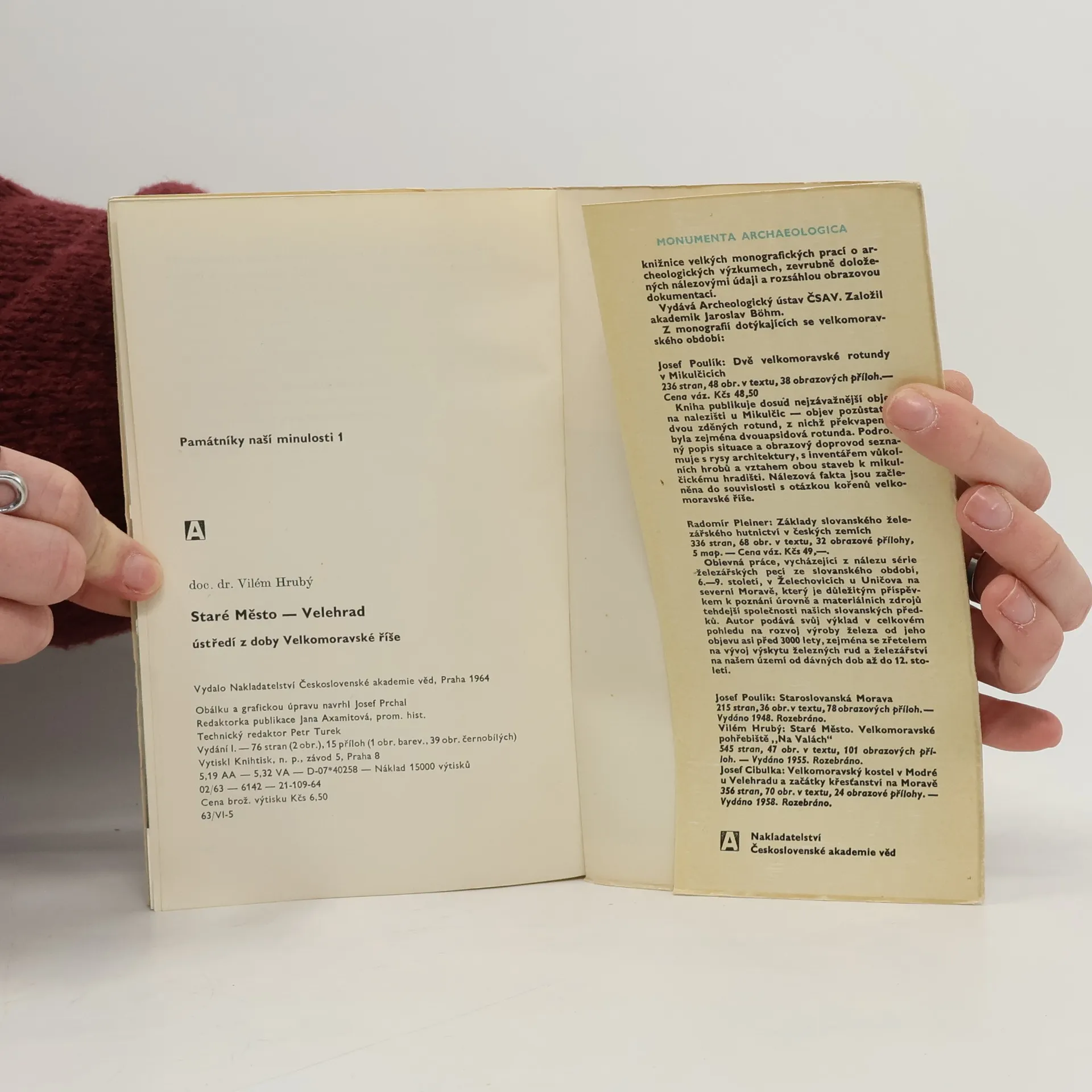 Monografická řada, věnovaná historickému pojetí výsledků velkých archeologických výzkumů v Československu. Památky naší minulosti 1 - Staré Město-Velehrad, ústředí z doby Velkomoravské říše.