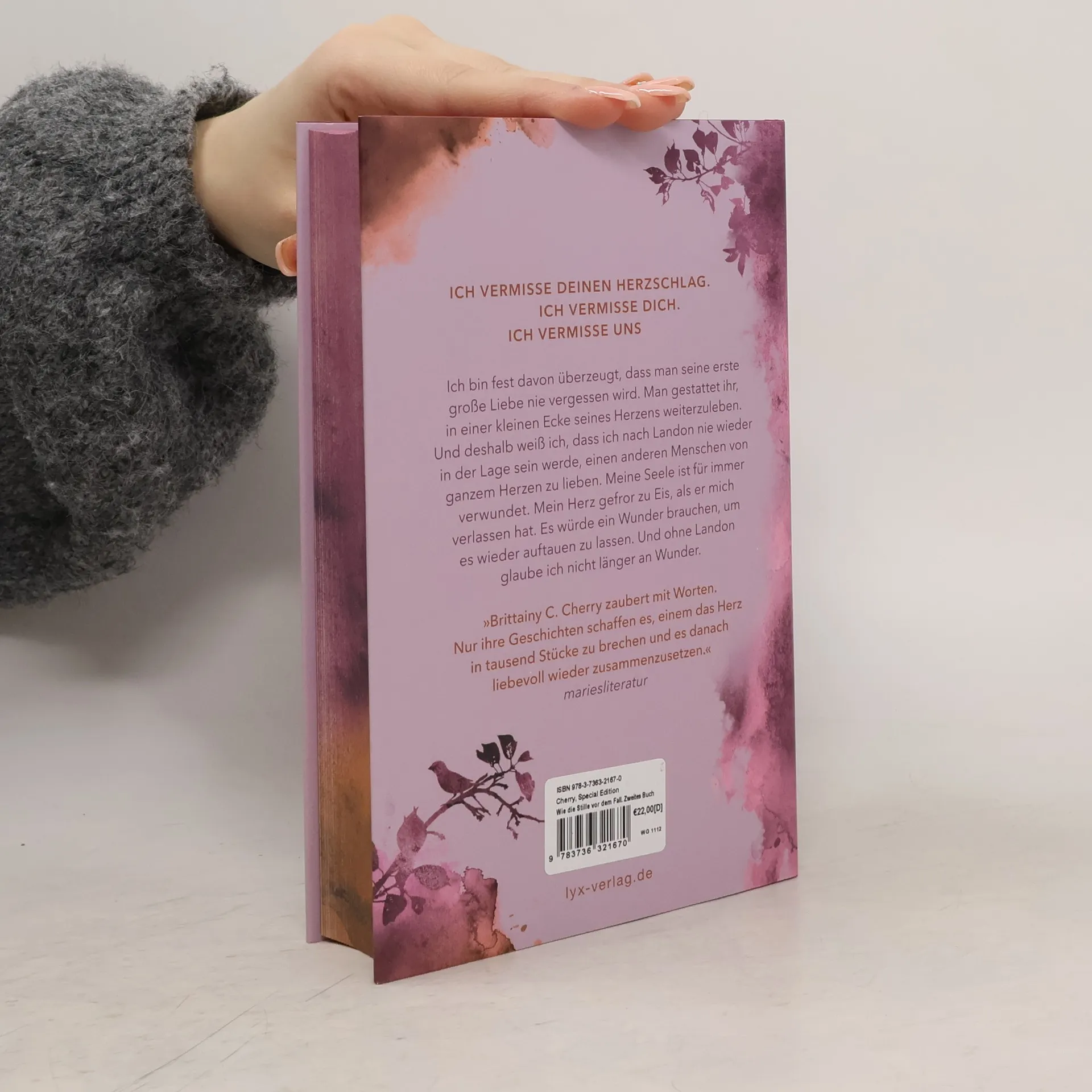 Die Special Edition von WIE DIE STILLE VOR DEM FALL. ZWEITES BUCH - Limitierte Special Edition - Hardcover mit Schutzumschlag und neuem Cover - Mit Farbschnitt passend zu den Covern - Mit Illustrationen auf Vor- und Nachsatzpapier von @german. potato. art Ich vermisse deinen Herzschlag. Ich vermisse dich. Ich vermisse uns. Ich bin fest davon überzeugt, dass man seine erste große Liebe nie vergessen wird. Man gestattet ihr, in einer kleinen Ecke seines Herzens weiterzuleben. Und deshalb weiß ich, dass ich nach Landon nie wieder in der Lage sein werde, einen anderen Menschen von ganzem Herzen zu lieben. Meine Seele ist für immer verwundet. Mein Herz gefror zu Eis, als er mich verlassen hat. Es würde ein Wunder brauchen, um es wieder auftauen zu lassen. Und ohne Landon glaube ich nicht länger an Wunder. "Brittainy C. Cherry zaubert mit Worten. Nur ihre Geschichten schaffen es, einem das Herz in tausend Stücke zu brechen und es danach liebevoll wieder zusammenzusetzen. mariesliteratur Zweiter Teil des zweiten Bandes der herzzerreißenden CHANCES-Reihe von SPIEGEL-Bestseller-Autorin Brittainy C. Cherry