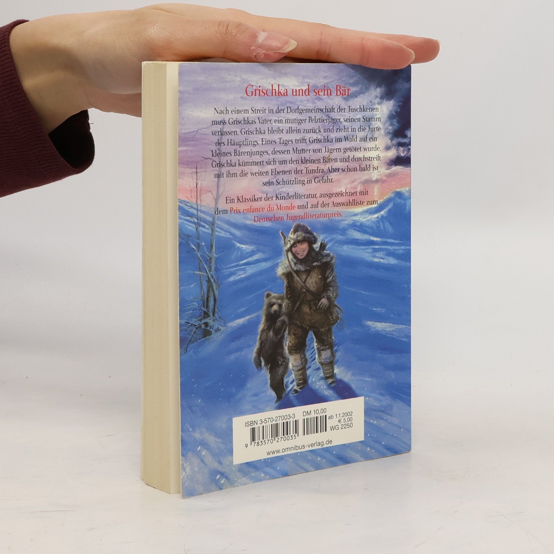 Grischka lebt in einem Dorf in der Tundra. Als sein Vater die Dorfgemeinschaft verlassen muss, bleibt Grischka allein zurück und zieht in die Jurte des Häuptlings. Eines Tages trifft Grischka im Wald auf ein kleines Bärenjunges, dessen Mutter von Jägern getötet wurde. Grischka kümmert sich um den kleinen Bären, aber schon bald ist sein Schützling in Lebensgefahr ...In der Auswahlliste zum Deutschen Jugendbuchpreis und ausgezeichnet mit dem Prix Enfance du Monde.