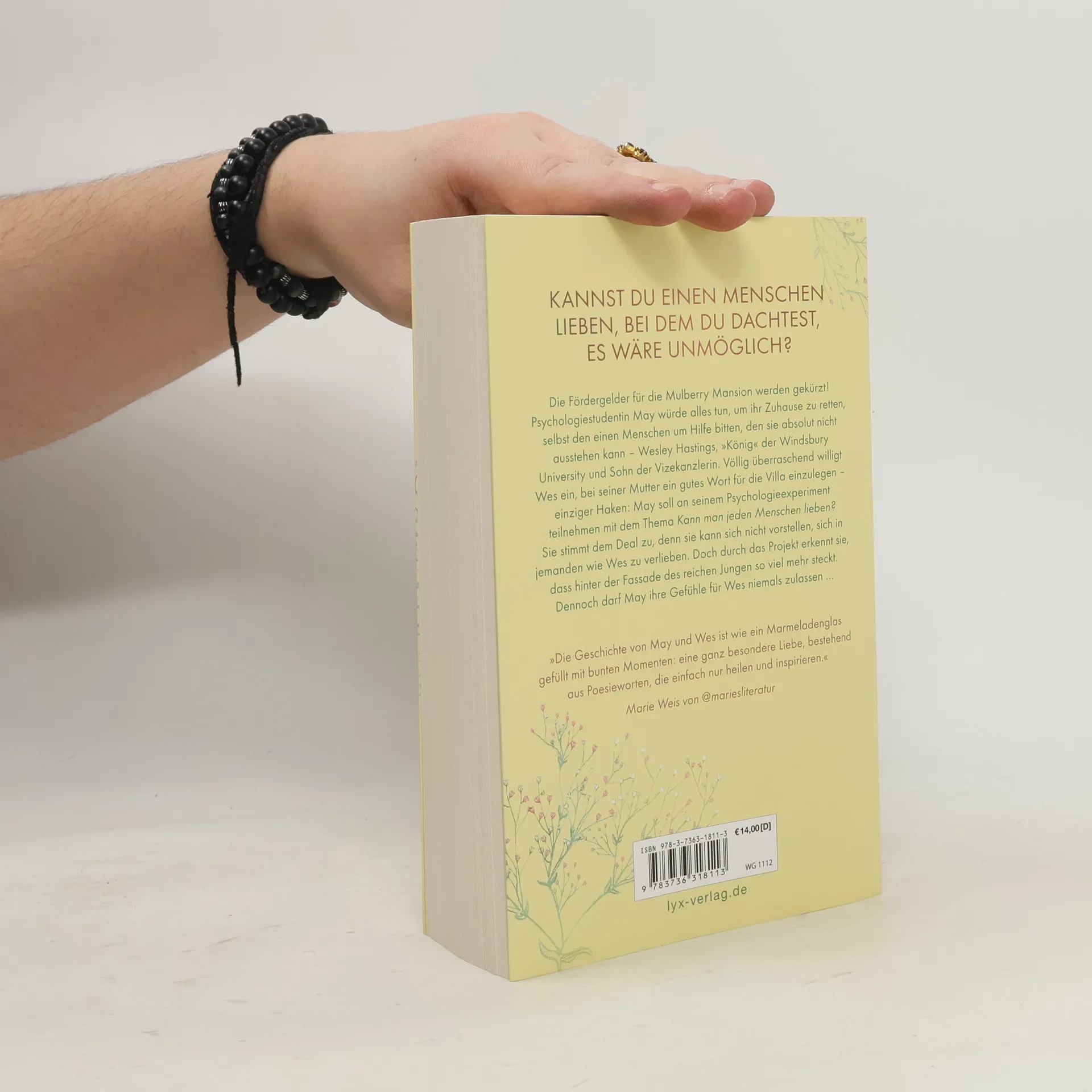 Kannst du einen Menschen lieben, bei dem du dachtest, es wäre unmöglich? Die Fördergelder für die Mulberry Mansion werden gekürzt! Psychologiestudentin May würde alles tun, um ihr Zuhause zu retten, selbst den einen Menschen um Hilfe bitten, den sie absolut nicht ausstehen kann - Wesley Hastings, „König“ der Windsbury University und Sohn der Vizekanzlerin. Völlig überraschend willigt Wes ein, bei seiner Mutter ein gutes Wort für die Villa einzulegen - einziger Haken: May soll an seinem Psychologieexperiment teilnehmen mit der These: Kann man jeden Menschen lieben? Sie stimmt dem Deal zu, denn sie kann sich nicht vorstellen, sich in jemanden wie Wes zu verlieben. Doch durch das Projekt erkennt sie, dass hinter der Fassade des reichen Jungen so viel mehr steckt. Dennoch darf May ihre Gefühle für Wes niemals zulassen ... „Die Geschichte von May und Wes ist wie ein Marmeladenglas gefüllt mit bunten Momenten: eine ganz besondere Liebe, bestehend aus Poesieworten, die einfach nur heilen und inspirieren.“ @ MARIESLITERATUR Band 2 der MULBERRY MANSION -Reihe von Merit Niemeitz, der großen Entdeckung beim LYX-Pitch