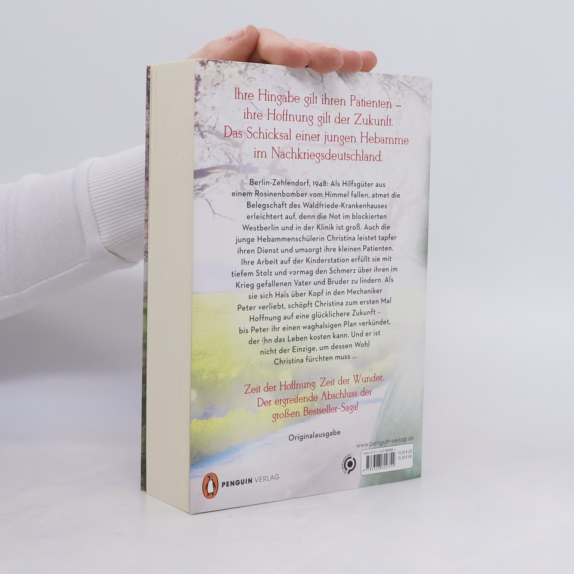 Ihre Hingabe gilt ihren Patienten, ihre Hoffnung gilt der Zukunft: Das Schicksal einer jungen Hebamme im Nachkriegsdeutschland. Das große Finale der Bestseller-Saga! Berlin-Zehlendorf, 1948: Als Hilfsgüter aus einem Rosinenbomber vom Himmel fallen, atmet die Belegschaft des Waldfriede-Krankenhauses erleichtert auf, denn die Not im blockierten Westberlin und in der Klinik ist groß. Auch die junge Hebammenschülerin Christina leistet tapfer ihren Dienst und umsorgt ihre kleinen Patienten. Ihre Arbeit auf der Kinderstation erfüllt sie mit tiefem Stolz und vermag den Schmerz über ihren im Krieg gefallenen Vater und Bruder zu lindern. Als sie sich Hals über Kopf in den Mechaniker Peter verliebt, schöpft Christina zum ersten Mal Hoffnung auf eine glücklichere Zukunft – bis Peter ihr einen waghalsigen Plan verkündet, der ihn das Leben kosten kann. Und er ist nicht der Einzige, um dessen Wohl Christina fürchten muss … Nach wahren Begebenheiten: Inspiriert von der Chronik einer Krankenschwester erzählt Erfolgsautorin Corina Bomann die Geschichte der Berliner Waldfriede-Klinik. Entdecken Sie die weiteren Bände der mitreißenden Waldfriede-Saga: 1. Sternstunde. Die Schwestern vom Waldfriede 2. Leuchtfeuer. Die Schwestern vom Waldfriede 3. Sturmtage. Die Schwestern vom Waldfriede 4. Wunderzeit. Die Schwestern vom Waldfriede Alle Bände der Saga sind auch einzeln lesbar.