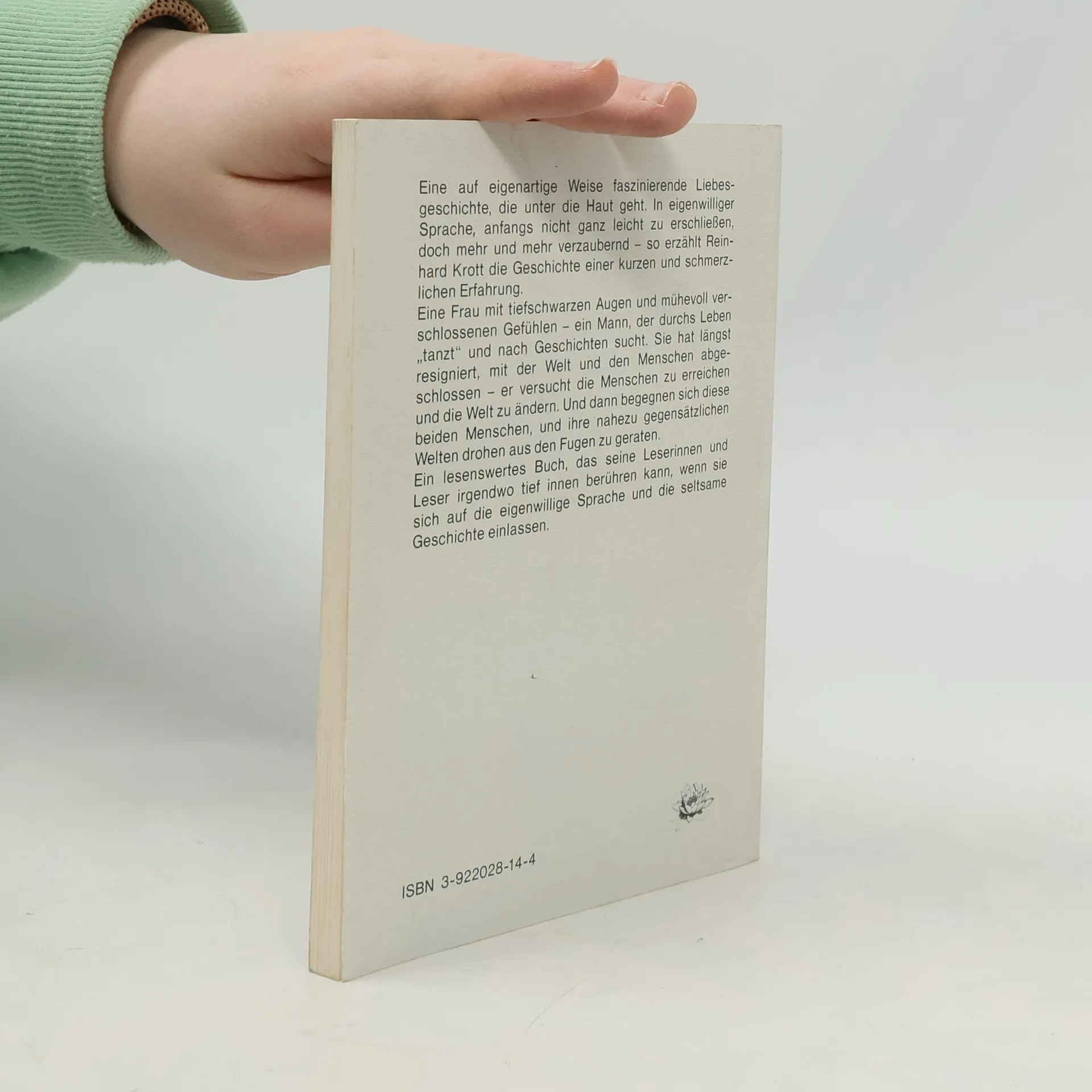 Eine auf eigenartige Weise faszinierende Liebesgeschichte, die unter die Haut geht. In eigenwilliger Sprache, anfangs nicht ganz leicht zu erschließen, doch mehr und mehr verzaubernd - so erzählt Reinhard Krott die Geschichte einer kurzen und schmerzlichen Erfahrung. Eine Frau mit tiefschwarzen Augen und mühevoll verschlossenen Gefühlen - ein Mann, der durchs Leben "tanzt" und nach Geschichten sucht. Sie hat längst resigniert, mit der Welt und den Menschen abgeschlossen - er versucht die Menschen zu erreichen und die Welt zu ändern. Und dann begegnen sich diese beiden Menschen, und ihre nahezu gegensätzlichen Welten drohen aus den Fugen zu geraten. Ein lesenswertes Buch, das seine Leserinnen und Leser irgendwo tief innen berühren kann, wenn sie sich auf die eigenwillige Sprache und die seltsame Geschichte einlassen.